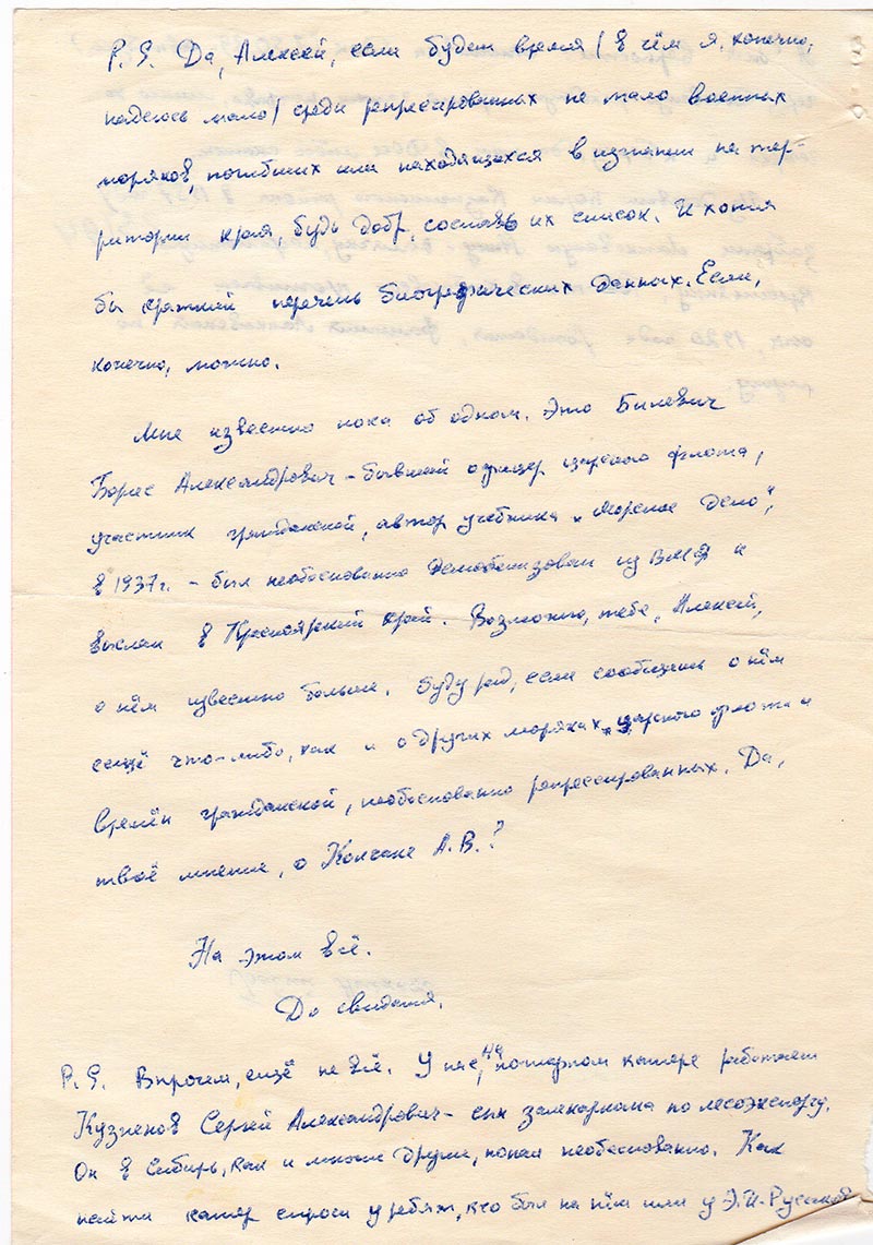 P.S. Да, Алексей, если будет время (в чем я, конечно, надеюсь мало) среди репрессированных не мало военных моряков, погибших или находящихся в изгнании на территории края, будь добр, составь их список. И хотя бы краткий перечень биографических данных. Если, конечно, можно.