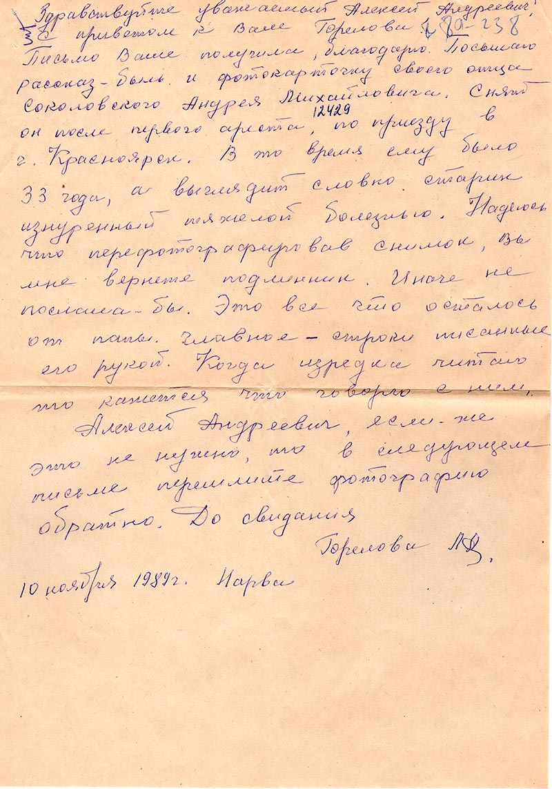 Письмо Ваше получила, благодарю. Посылаю рассказ-быль и фотокарточку своего отца Соколовского Андрея Михайловича. Снят он после первого ареста, по приезду в г. Красноярск. В то время ему было 33 года, а выглядит словно старик, изнуренный тяжелой болезнью. Надеюсь, что перефотографировав снимок, Вы мне вернете подлинник. Иначе, не послала бы. Это все что осталось от папы. Главное - строки писанные его рукой. Когда изредка читаю то кажется что говорю с ним.
