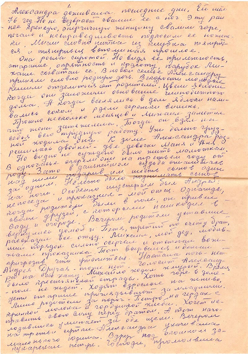 Александра доживала последние дни. Ей шел 76 год. Но не возраст свалил ее с ног. Эту ранее крепкую, энергичную женщину свалили горе, печаль и несправедливость подкосили ее ноженьки. Мысли словно нитка из клубка тянуться и тянуться вспоминая прошлое.