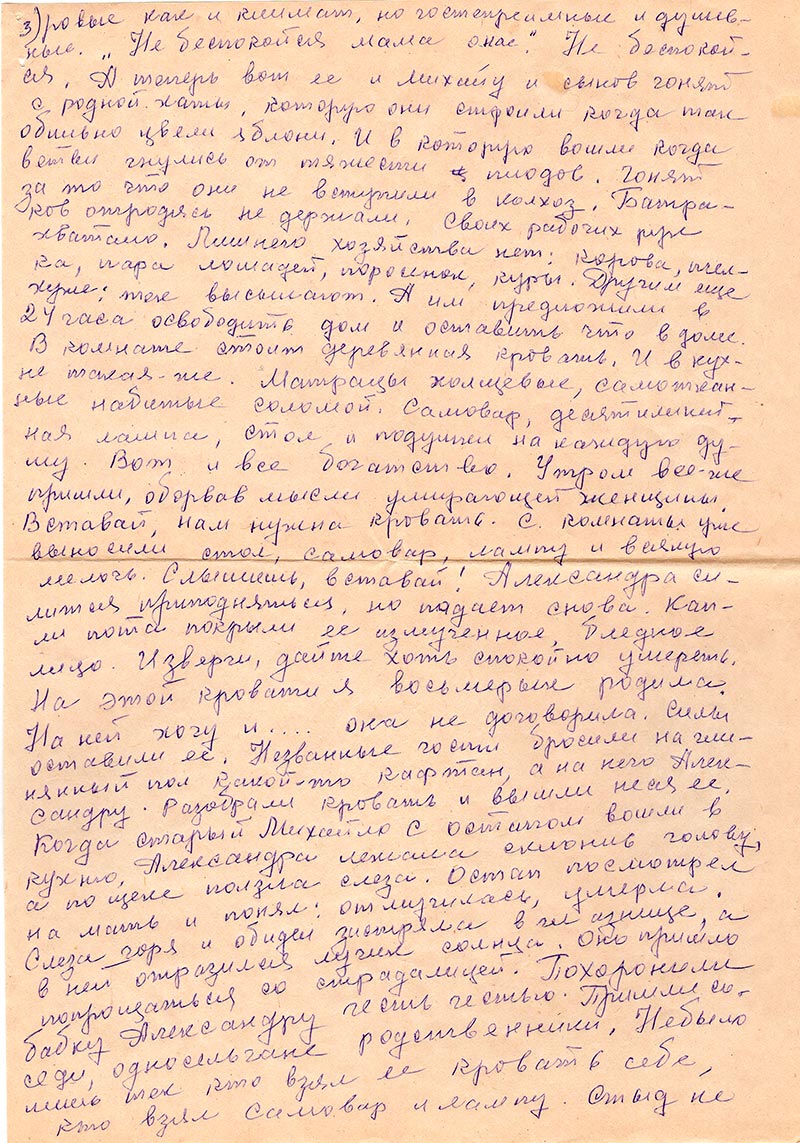 Бежит время, бежит торопиться. Уж у сына с невесткой растут 2 дочери: Зина и Люся. Давно свергнули царя еще до женитьбы сына. Давно уж власть рабочих и крестьян, но Александра с мужем как ходили босиком, так и ходят. Разве к сватам в гости едут или в церков идут на престольный праздник, муж идет в сапогах, а она в ботинках. Но горе не за горами ходит, оно всегда рядом за плечами. Там и тут.