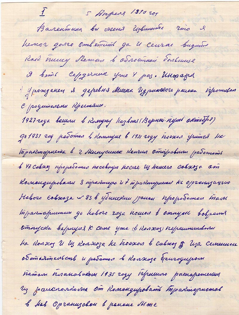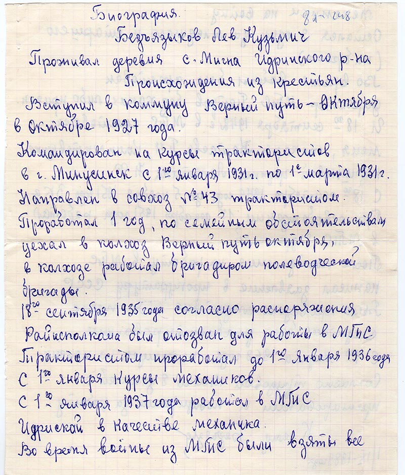 На колхоз и из колхоза не поехал в совхоз иза семейных обстоятельств и рабтал в колхозе бригодиром потом плановиком 1935 году пришло распорежение из раисполкома от комондировать трактористов в нов организован в раионе МТС