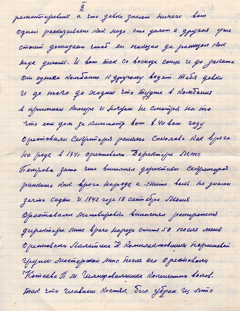 И до того до ходили что тудше в комбания в приемной камере и ночуем не смотря на то что ест дом за километр вот в 40вом году орестовали секретаря раикома Соколова как врага на рода в 1941 орестовали Деректора МТС Петрова зато что выполнял директивы секретаря раикома как врага народа а мыто воть не знали зачто садят И 1942 года 18 сентябрь меня ореставали мотивировка выполнял распорежения директора МТС врага народа статья 58 после меня орестовали Лалетина Н. Комплектовщика поршневой группы мастерской МТС После его орестовали Котаева П. М. шлифовальщика коленчатых валов. так что главным костяк был убран из МТС