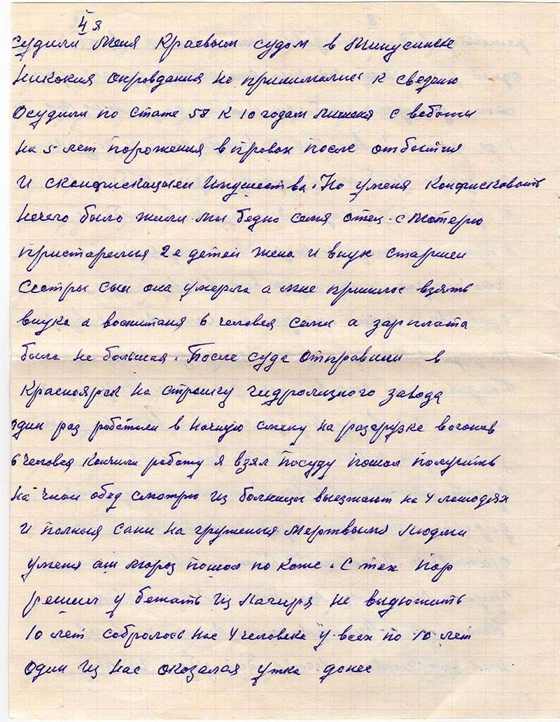 Судили меня краевым судом в Минусинске никакия оправдания не принимали к сведению осудили по статье 58 к 10 годам лишения с вободы на 5-лет порожения в провах после отбытия И сконфискацыем имущества. Но уменя конфискавать нечего было жили мы бедно семя отец с матерью пристарелые 2е детей жена и внук старшеи сестры сын она умерла а мне пришлос взять внука а воспитаня 6 челове семи а зарплата была не большая. После суда отправили в Краснояск на стройку гидролизного завода один раз работали в ночную смену на разгрузке вогонов 6 человек кончили работу я взял посуду пошол получить на чной обед смотрю из больницы выезжают на 4 лошодях и полные сани на груженые мертвыми людьми уменя аш мороз пошол по коже. С тех пор решил у бежать из лагиря не выдюжить 10 лет собралось нас 4 человека у всех по 10 лет