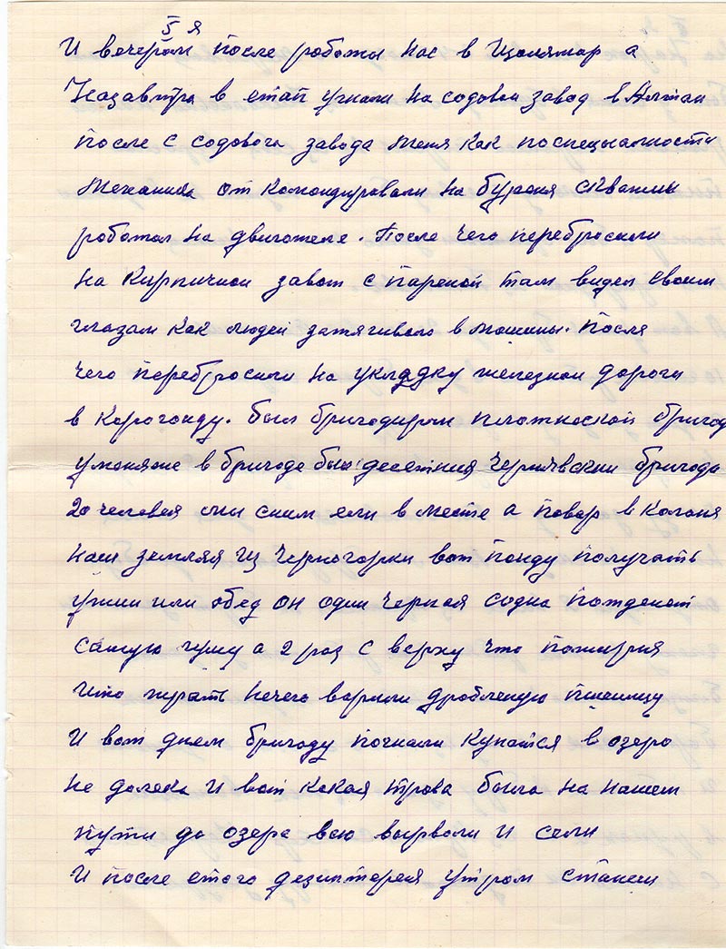 после с содовога завода меня как поспециальности механика от комондировали на буренья скважин работал на двиготеля. После чего перебросили на кирпичный завот с ???? там видел своим глазам как людей затягивало в машины. После чего перебросили на укладку железнои дороги в Корогонду. был пригодиром плоткоской бригады уменяже в бригаде был ???? ???? бригада 20 человек мы с ним ели в месте а повар в колоня наш земляяиз Черногорки вот поиду получать ужин или обед он один черпая содна потденет самуюгущу а 2 раз с верху что пожирня ито жрать нечего варили дробленую пшеницу и вот днем бригаду погнали купатся в озеро не долеко и вот какая трова была на нашем пути до озера всю вырвали и сели