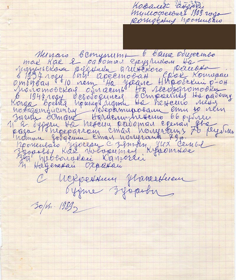 Желаю вступить в ваше общество так как я работал грузчиком на Мазульском руднике Ачинского района в 1937 году был арестован срок который отбывал 10 лет на урале Ниробский р-он Молотовская область на лесозаготовки