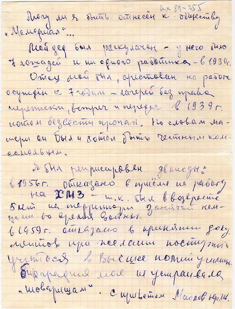 Я был реприсирован дважды: в 1956 г. отказано в приеме на работу на ХМЗ-т.к. был в возрасте 5 лет на территори занятой немцами во время войны. В1959 г. отказано в принятии документов при желании поступить учиться в Высшее полит училище биография моя не устраивала «товарищам».