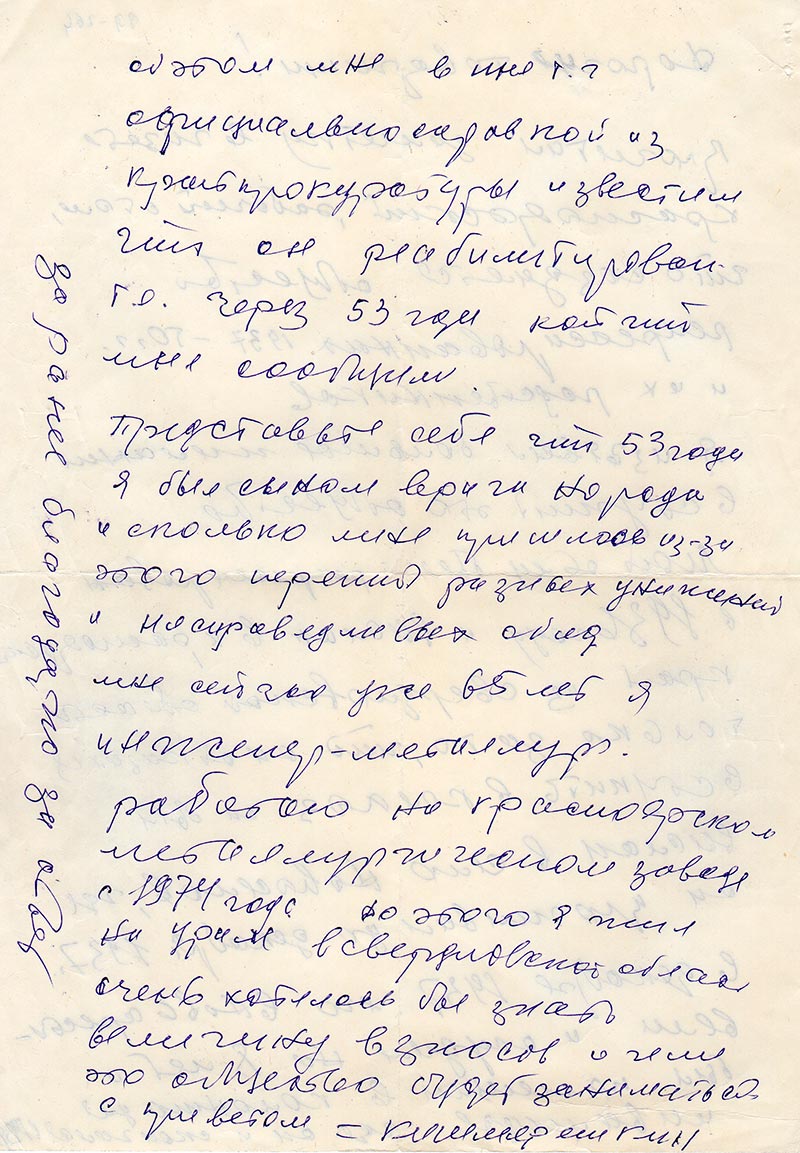 в декобре 1937 г. его вновь арестовели и осудиле на 8 лет и был помещен в колонию для инвалидов где он и скончался в 1938 об этом мне в июне т.г. официально справкой из крайпрокуротуры известиле что он реабилитирован- т.е. через 53 гола мне сообщили.