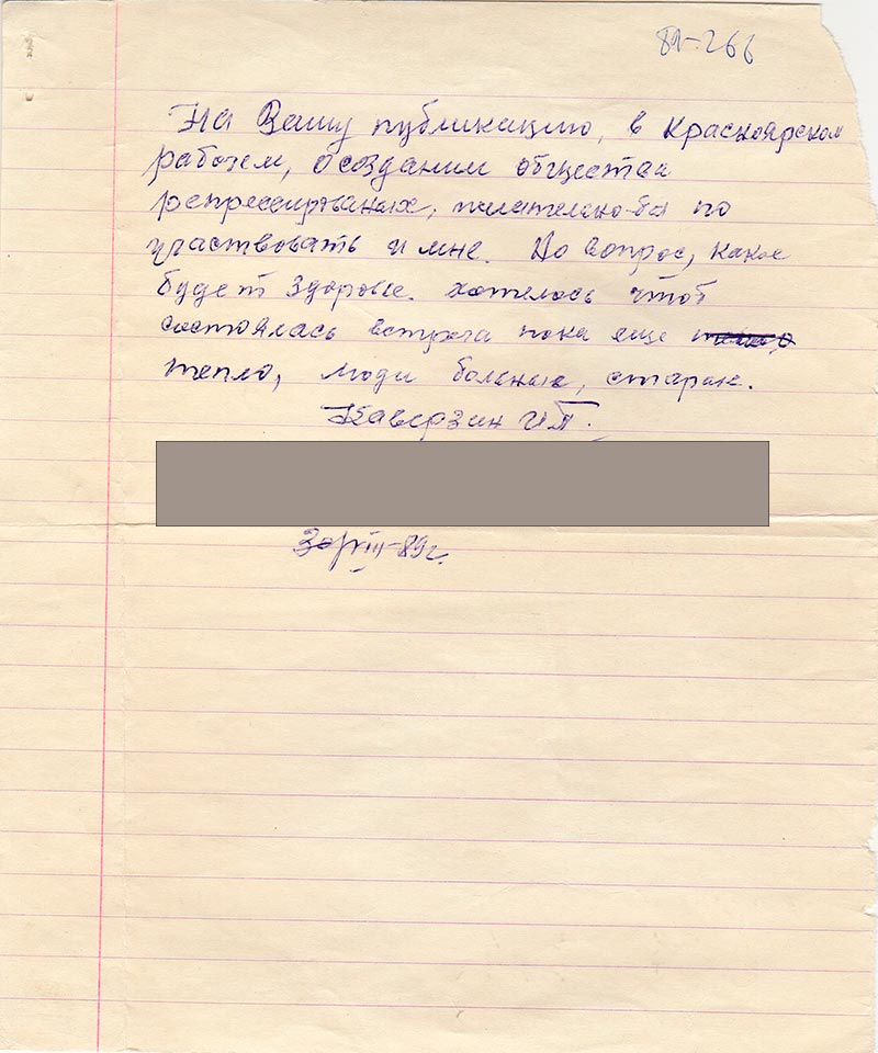 На Вашу публикацию, в Красноярском рабочем, о создании общества репрессированых, жлательно-бы по участвовать и мне. Но вопрос, какое будет здоровье. хотелось чтоб состоялась встреча пока еще тепло, люди больные, старые.