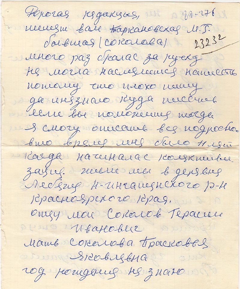 Много раз бралас за ручку не могла насмелится написать потому что плохо пишу да и не знаю куда писать если вы поможете тогда я смогу описать все подробно. вто время мне было 11 лет кагда начиналас колективизация. жили мы в деревне Лебяжье Н-ингашского р-н Красноярского края.