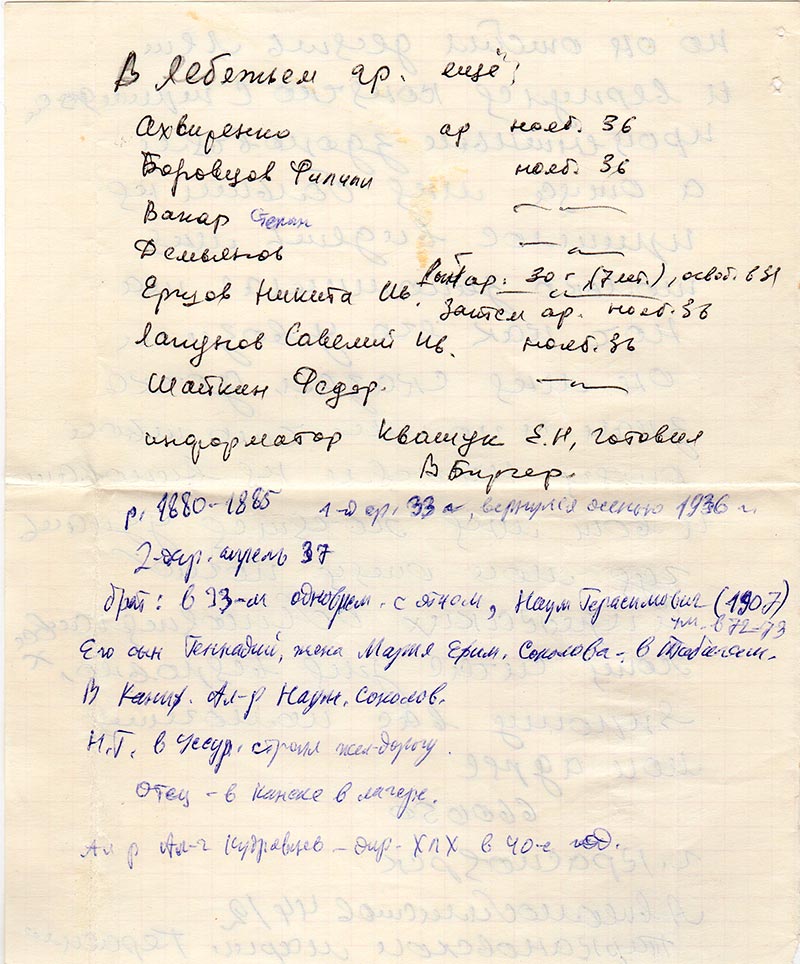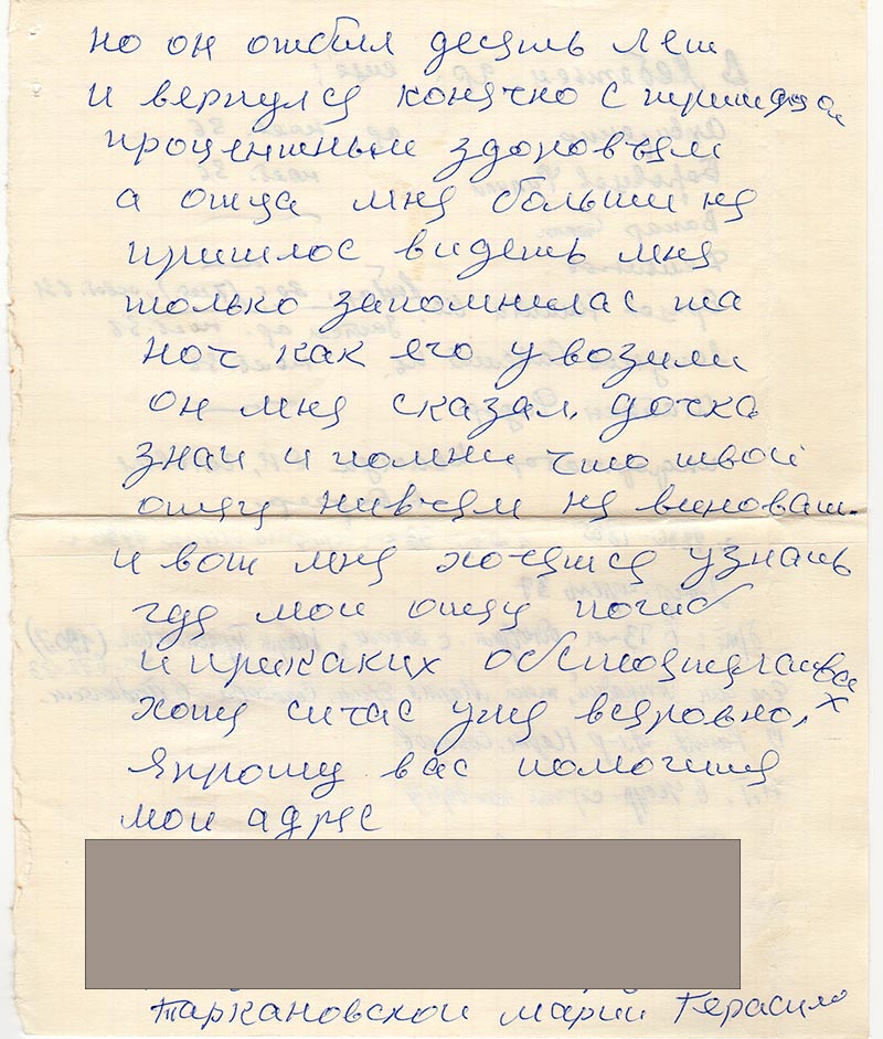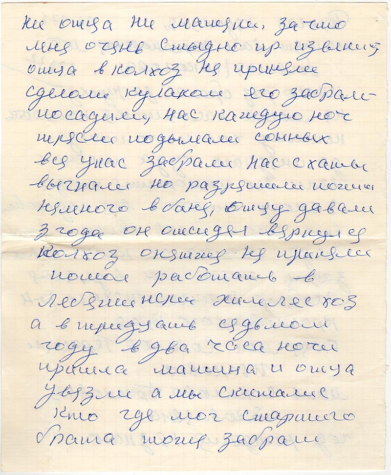 Год рождения не знаю ни отца ни матери, за что мне очень стыдно пр извинить. отца в колхоз не приняли сделоли кулаком его забрали-посадили, нас каждую ноч трясли подымали сонных все унас забрали нас схаты выгнали но разрешили пожить( немного в бане, отцу давали 3 года он отсидел вернулся колхоз опятже не приняли пошол работать в Лебяжинский химлесхоз а в тридцать седьмом году в два часа ночи пришла машина и отца увезли а мы скиталис кто где мог старшего брата тоже забрали но он отбыл 10 лет и вернулся конечно с ??? процентным здоровьем а отца мне больши не пришлос видеть мне только запомнилас та ноч как его увозили он мне сказал, дочка знай и помни что твой отец нивчем не виноват.