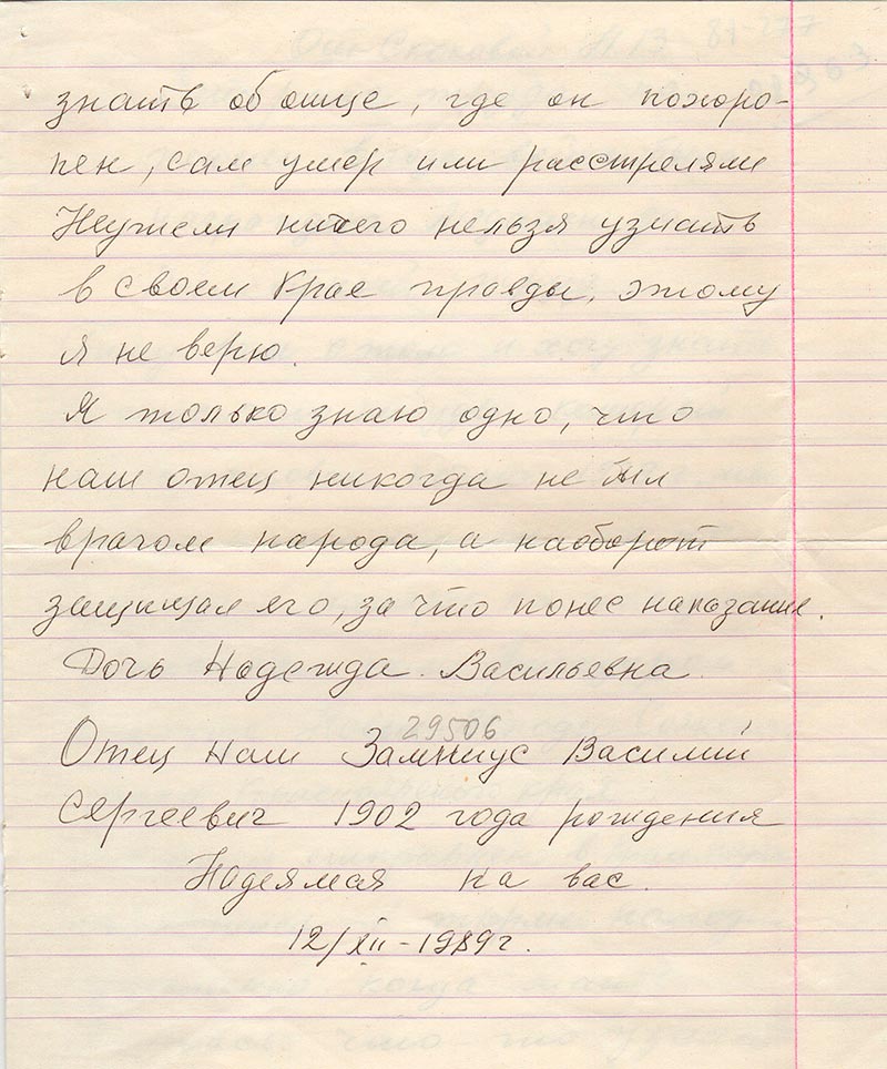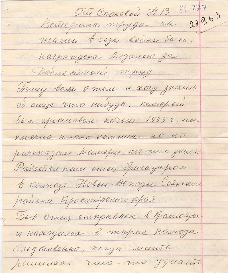 Пишу вам о том и хочу знать об отце что-нибудь, который был арестован ночью 1939 г, мы конечно плохо помним, но по рассказам Матери, кое-что знаем.