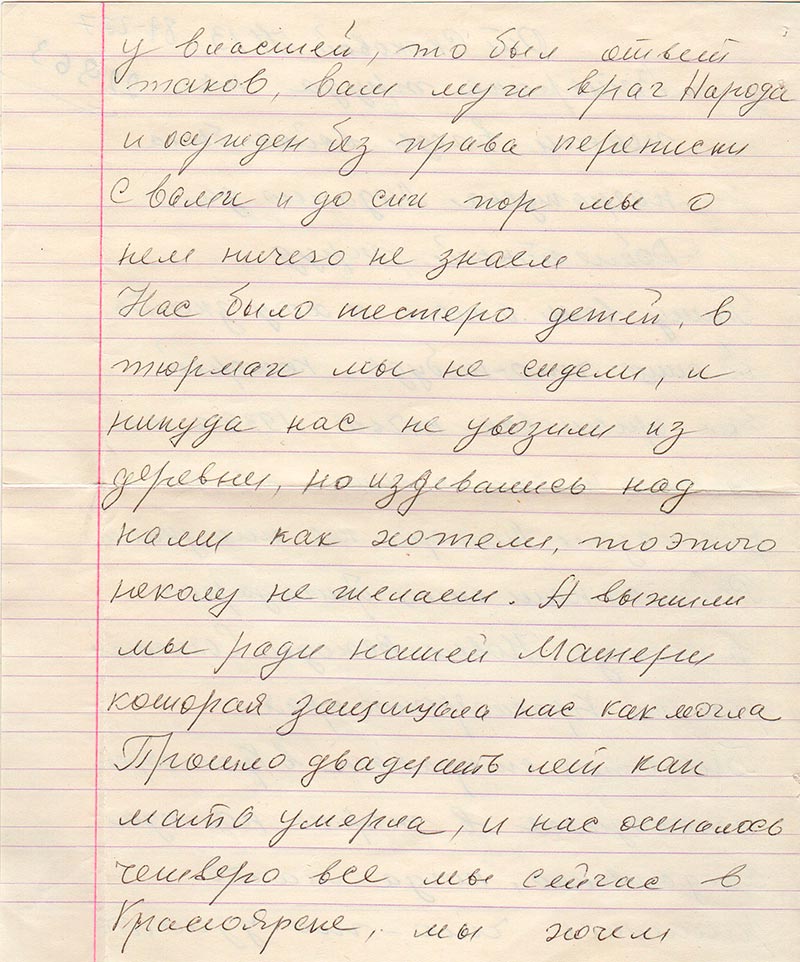Был отец отправлен в Красноярск и находился в тюрьме полгода следственно, когда мать решилась что-то узнать у властей, то был ответ таков, ваш муж враг Народа и осужден без права переписки с вами и до сих пор мы о нем ничего не знаем Нас было шестеро детей, в тюрьмах мы не сидели, и никуда нас не увозили из деревни, но издевались над нами как хотели, то этиго некому не желаем. А выжили мы ради нашей Матери которая защищала нас как могла.