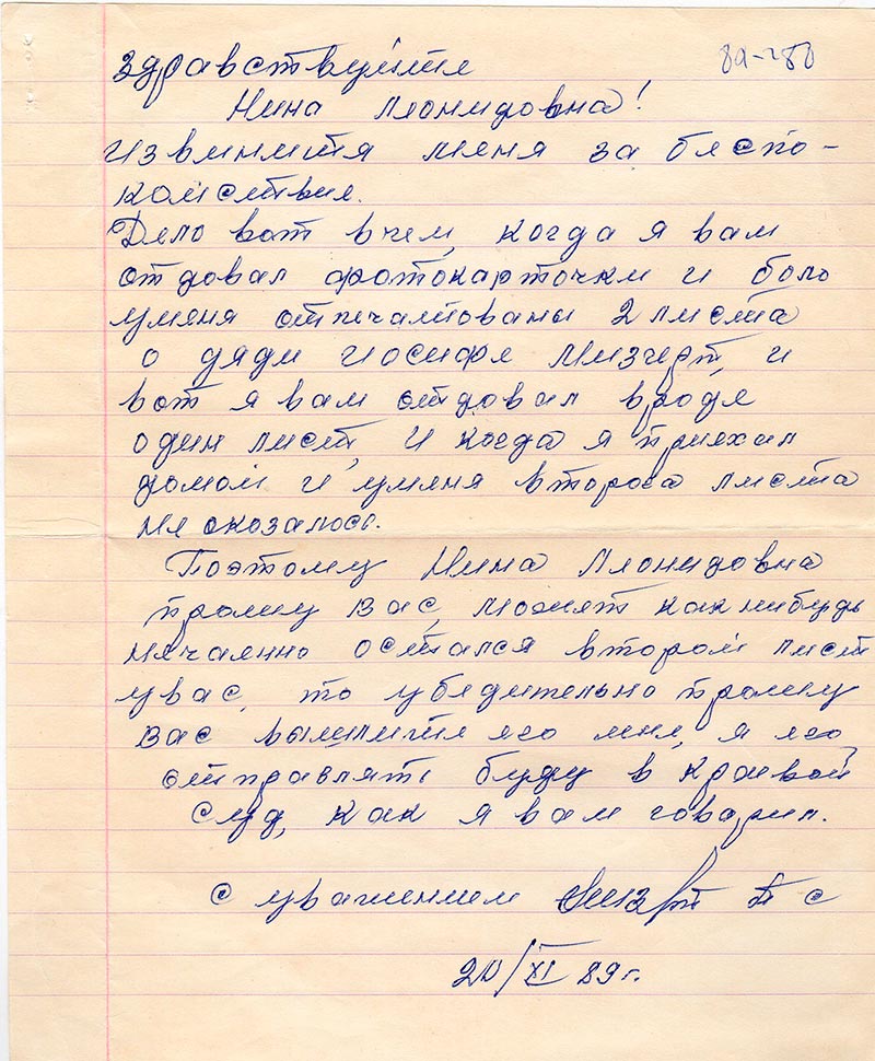 Дело вот в чем, когда я вам отдавал фотокарточки и боло у меня отпечатованы 2 листа о дяди Иосифе Мизгерт, и вот я вам отдавал вроде один лист, и когда я приехал домой и у меня второго листа не оказалось.
