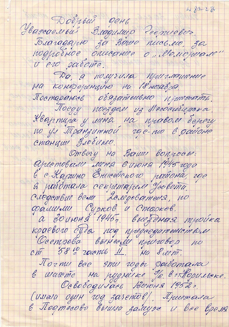 Благодарю за Ваше письмо, за подробное описание о «Мемориале» и его работе.