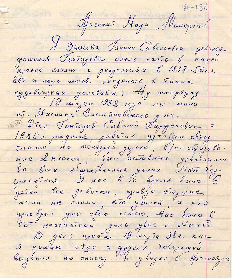 Я Зыкова Галина Савельевна, девичья фамилия Гонтарева. Очень часто в нашей прессе читаю о репрессиях в 1937-50 гг. вот и наша семья оказалась в таких чудовищных условиях: Ну попорядку.