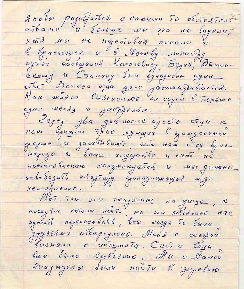 Через два дня после ареста отца к нам пришли трое мунщин в гражданской форме и зачитывают, что наш отец враг народа и ваше имущество и скот по постановлению конфескуется и мы должны освободить квартиру принадлежащая ж.д. немедленно.