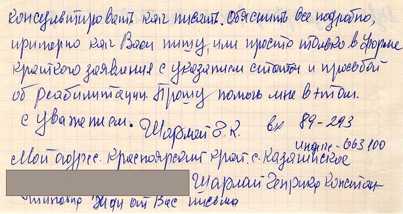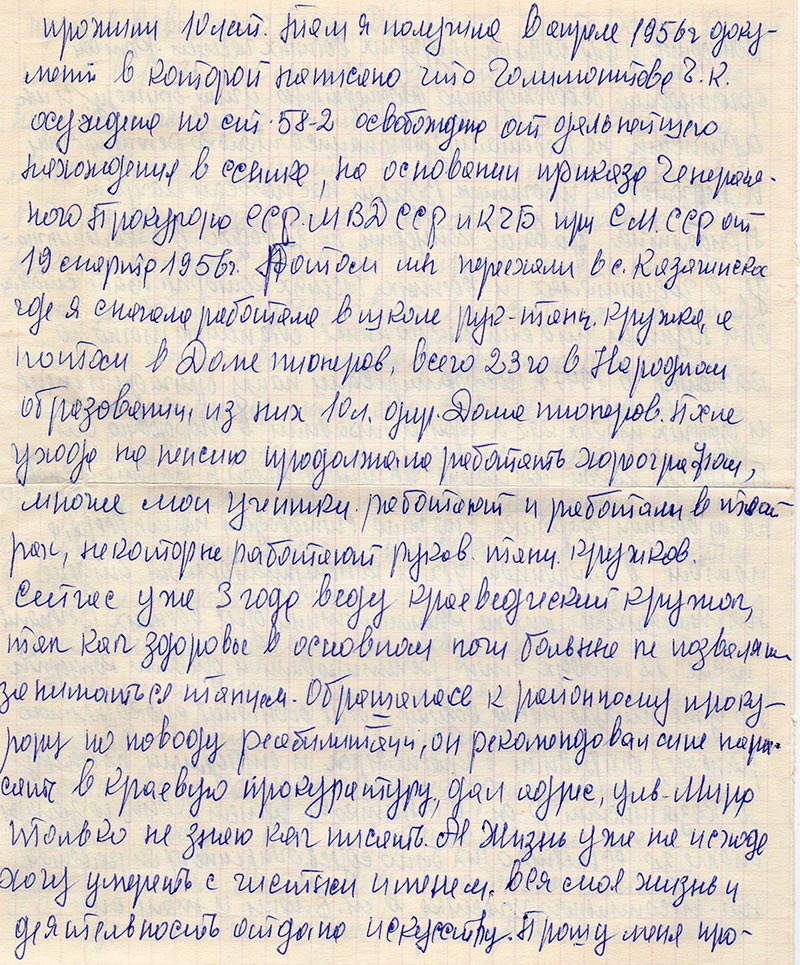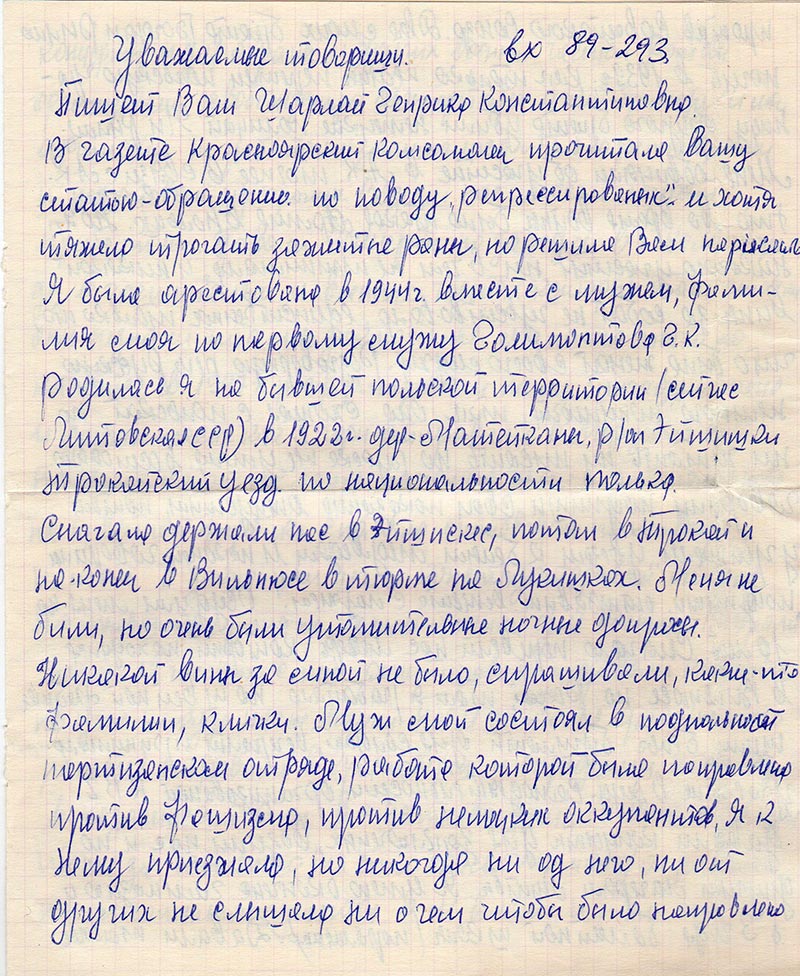 В газете Красноярский комсомолец прочитала Вашу статью-обращение по поводу «репрессированых» и хотя тяжело трогать зажитые раны, но решила Вам написать. Я была арестована в 1944 г. вместе с мужем, фамилия моя по первому мужу Голимоп(н)това Г.К. родилась я на бывшей польской территории (сейчас Литовская ССР) в 1923 г. дер. Матейканы, р/он Эйшишки Трокяйский [прим. ред: Трокский] уезд по национальности полька.