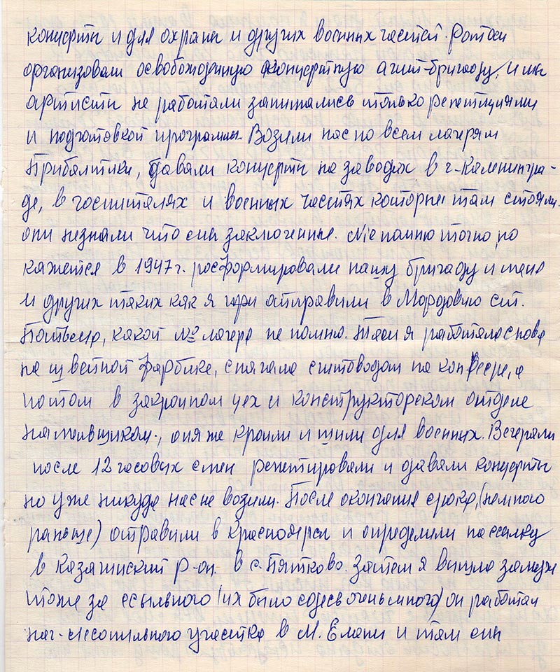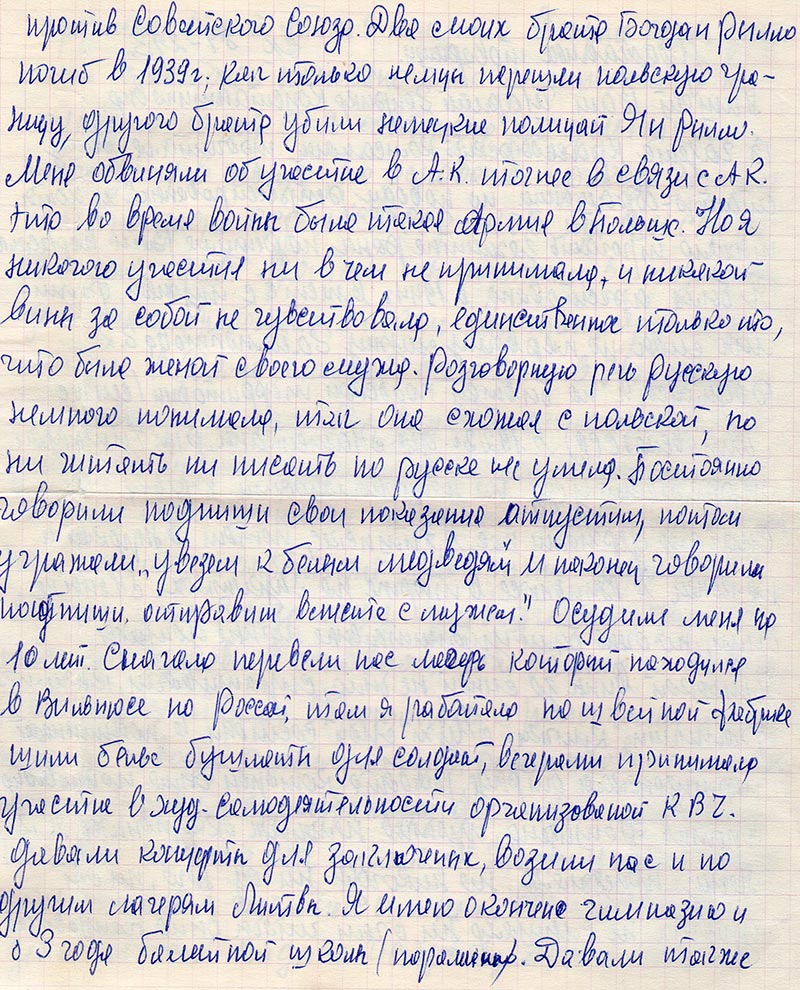 Меня обвиняли об участие в А.К. точнее в связи с А.К. это во время войны была такая Армия в Польше. Но я никакого участия ни в чем не принимала и никакой вины за собой не чувствовала, единственное только то, что была женой своего мужа. Разговорную речь русскую немного понимала, так она схожая с польской, но ни читать ни писать по русски не умела. Постоянно говорили подпиши свои показания отпустим, потом угрожали «увезем к белым медведям» и наконец говорили «подпиши, отправим вместе с мужем». Осудили меня на 10 лет. Сначала перевели нас лагерь который находился в Вильнюсе по Россой, там я работала на швейной фабрике шили белье бушлаты для солдат, вечером принимала участие в худ. самодеятельности организованной КВЧ. Давали концерты для заключеных, возили нас и по другим лагерям Литвы. Я имею окончено гимназию и 3 года балетной школы (поралельно???). Давали также концерты и для охраны и других военных частей. Р[П]отом организовали освобожденную концертную агитбригаду. И мы артисты не работали занимались только репетициями и подготовкой программы. Возили нас по всем лагерям Прибалтики, давали концерты на заводах в г. Калиниграде, в госпиталях и военных частях которые там стояли. Они не знали что мы заключенные. Не помню точно, но кажется в 1947 г. росформировали нашу бригаду и меня и других таких как я отправили в Мордовию ст. По́тьма, какой № лагеря не помню. Там я работала снова на швейной фабрике, сначала считоводом на конресне???, а потом в закройном цех и конструкторском отделе наменвщиком???, оня же кроили и шили для военных. Вечером после 12 часовых смен репетировали и давали концерты но уже никуда нас не возили. После окончания срока, (немного раньше) отправили в Красноярск и определили по ссылку в Казачинский р-он, в с. Пятково. Затем я вышла замуж тоже за ссыльного (их здесь было очень много) он работал нач. лесопильного участка в М. Елани и там мы прожили 10 лет. Там я получила в апреле 1956 г. документ в которой написано что Голимонтова Г.К. осуждена по ст. 58-2 освобождена от дальнейшего нахождения в ссылке, на основании приказа генерального Прокурора ССР МВД ССР и КГБ при СМ ССР от 19 апреля 1956 г. Потом мы переехали в с. Казачинское где я сначала работала в школе рук. танц. кружка, а потом в Доме пионеров, всего 23го в Народном образовании из них 10л. дир. Дома пионеров. После ухода на пенсию продолжала работать хореографом, многие мои ученики работают и работали в театрах, некоторые работают руков. танц. кружков.
