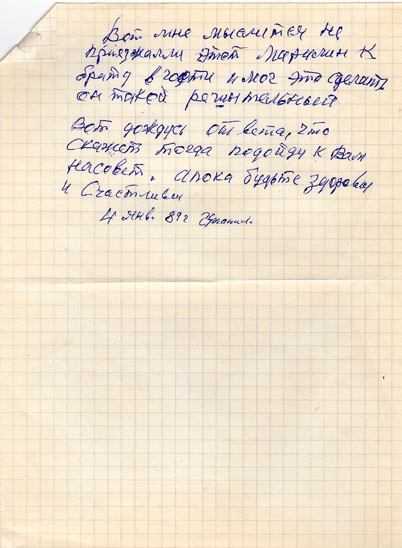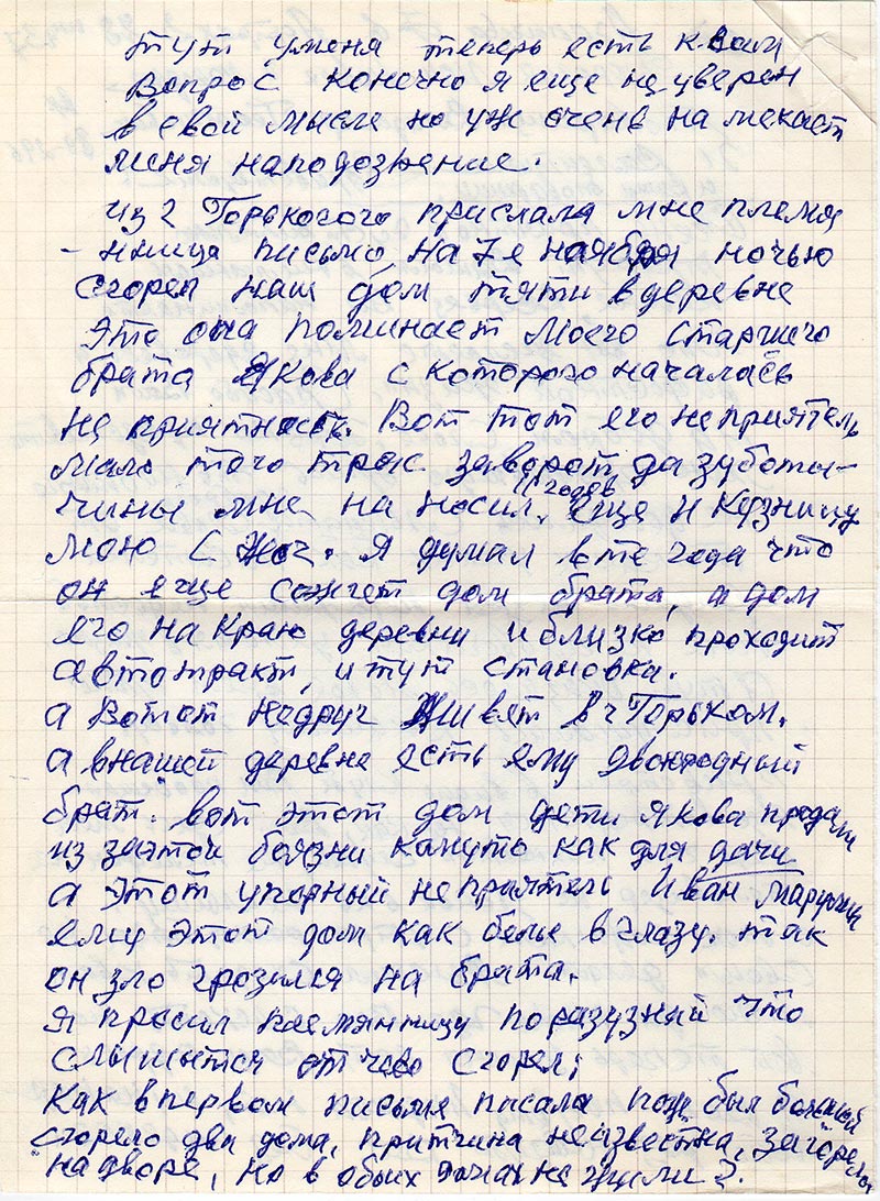 Из г. Горького прислала мне племянница письмо, на 7-е ноября ночью сгорел наш дом тяти в деревне. Это она поминает моего старшего брата Якова с которого началась не приятность. Вот тот его не приятель мало того ??? заворот да зуботычины мне носил 11 годов еще и кузнецу мою сжог. Я думал вте года что он еще сожгет дом брата, а дом его на краю деревни и близко проходит автотракт, и тут становка.