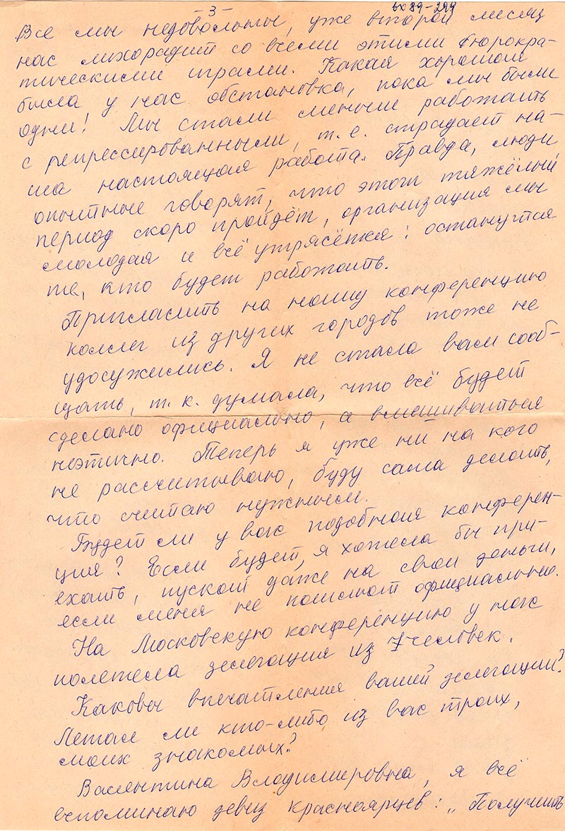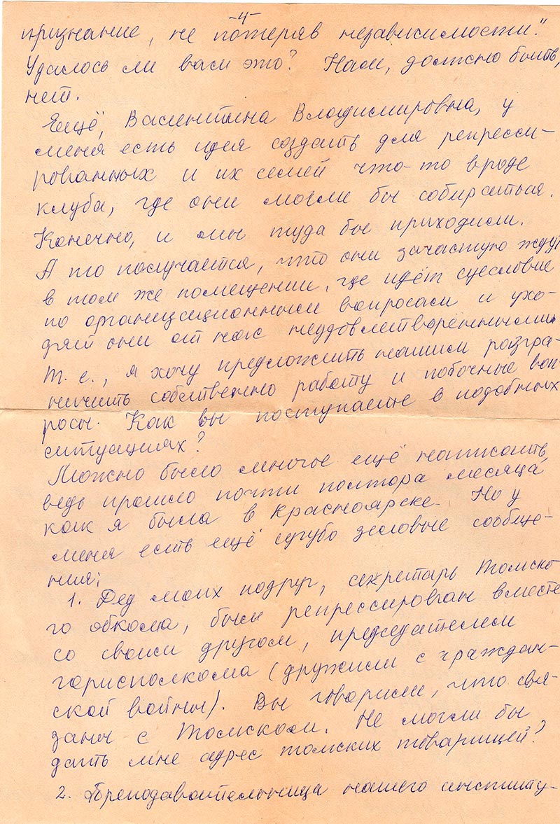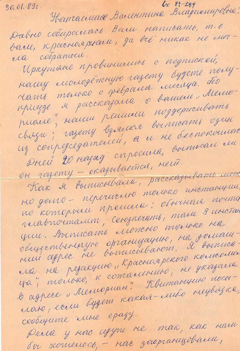 Иркутяне провинились с подпиской, нашу молодёжную газету будете получать только с февраля месяца. По приезде я рассказала о вашем «мемориале», наши решили поддерживать связи; газету взялся выписать один из сопредседателей, я и не беспокоилась. Дней 20 назад спросила, выписал ли он газету – оказывается нет.