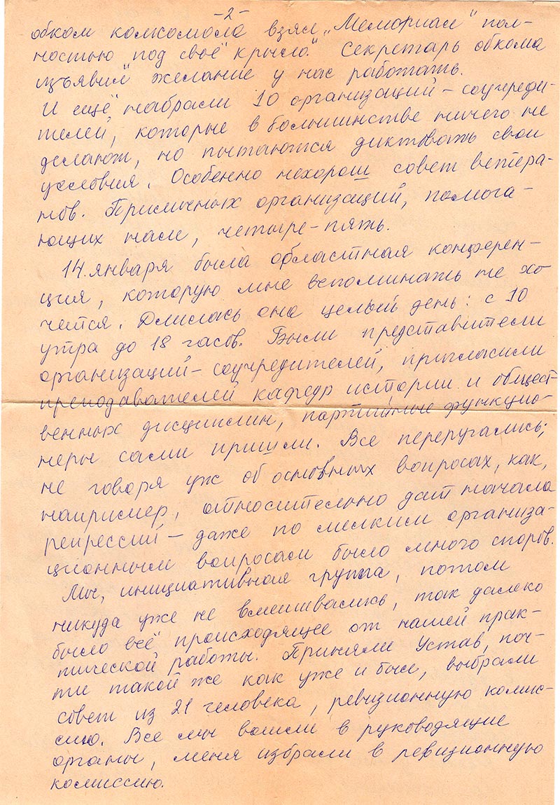 14 января была областная конференция, которую мне вспоминать не хочется. Длилась она целый день: с 10 утра до 18 часов. Были представители организаций – соучредителей, пригласили преподавателей кафедр истории и общественных дисциплин, партийные функционеры сами пришли. Все переругались; не говоря уж об основных вопросах, как, например, относительно дат начала репрессий – даже по мелким организационным вопросам было много споров.
