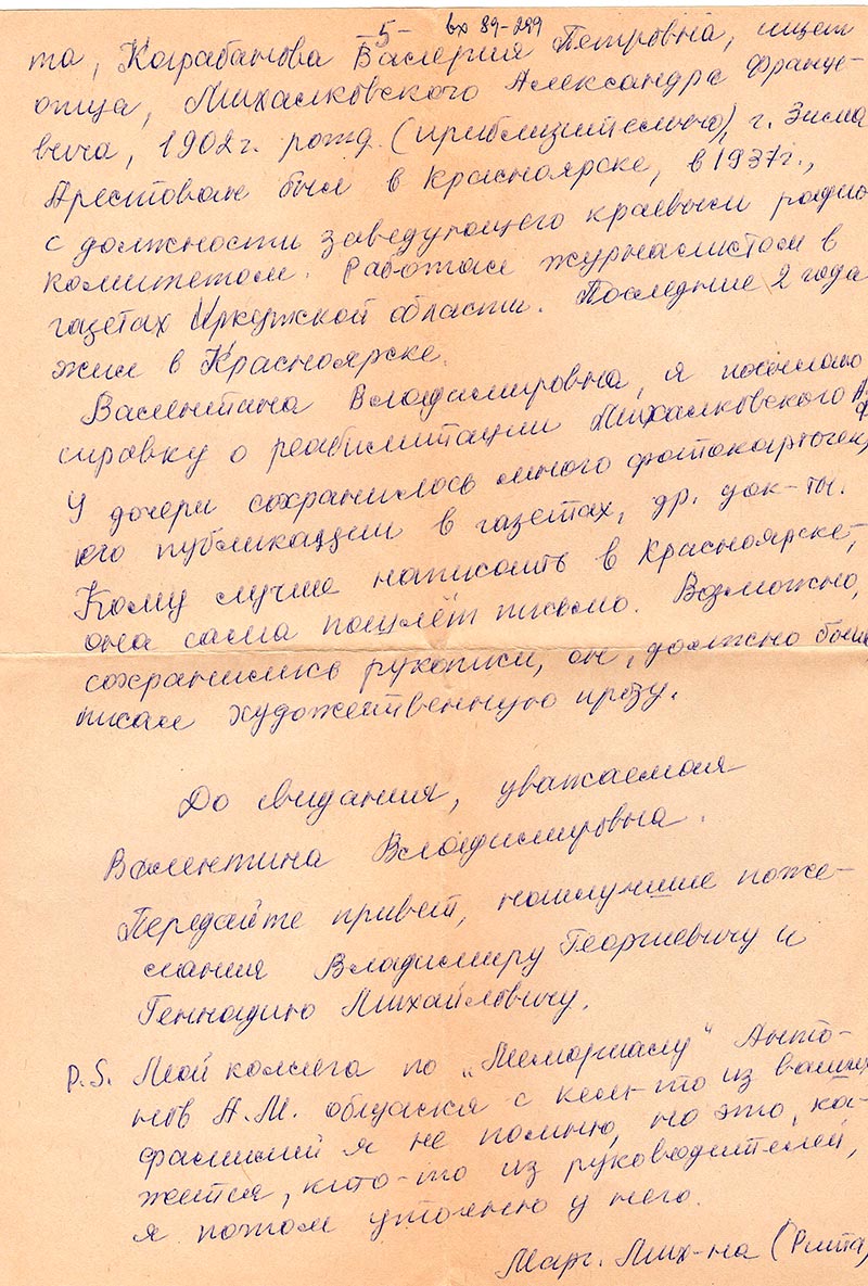 Валентина Владимировна, я послыаю справку о реабилитации Михалковского А.Ф. У дочери сохранилось много фотокарточек, его публикации в газетах, др. док-ты. Кому лучше написать в Красноярске, - она сама пошлёт письмо. Возможно, сохранились рукописи, он, должно быть, писал художественную прозу.