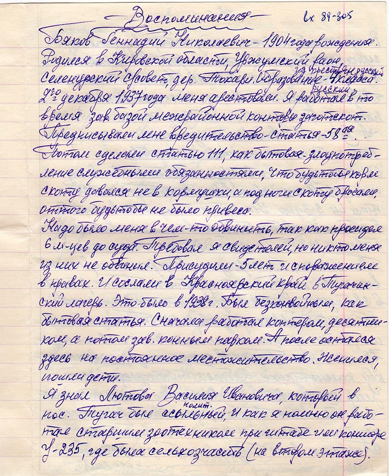 Бяков Геннадий Николаевич – 1904 года рождения. Родился в Кировской области, Уржумский раон, Селенурский с/совет, дер. Токари. Образование из крестьян русский – 4 класса. 2-го декабря 1937 года меня арестовали. Я работал в то время зав. базой межрайонной конторы заготскот. Предписывали мне вредительство – статья 58-ая. Потом сделали статью 111, как бытовая – злоупотребление служебными обязанностями. Что будьтобы корм скоту давался не в кормушках, а под ноги скоту бросали, оттого будьтобы не было привеса.