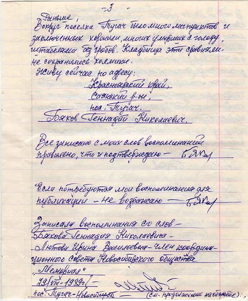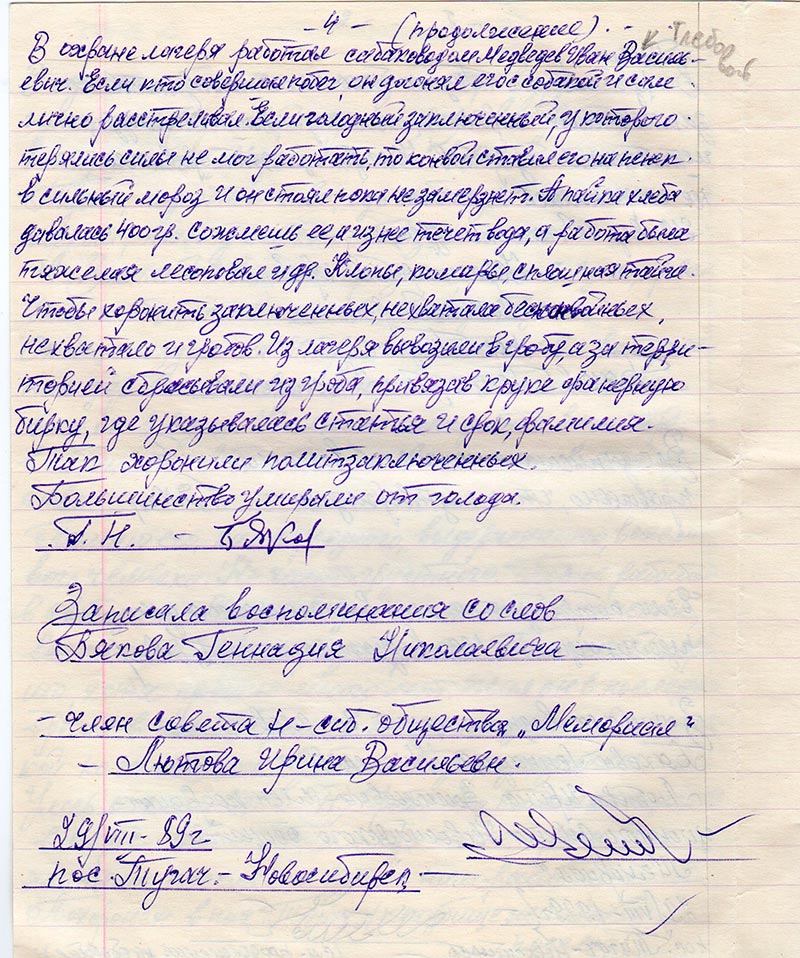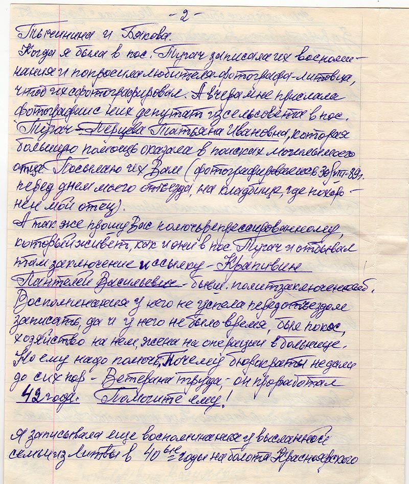 Я записывала еще воспоминания у высланной семьи из Литвы в 40ые годы на болота Красноярского края (где их сын с семьей живет в пос. Тугач и он фотографировал Тычинина и Бякова 30/VIII-89 г. на кладбище). (Янцевичус Алгис Бгозович). Мне надо у литовца кое-что уточнить. Вышлю позже.