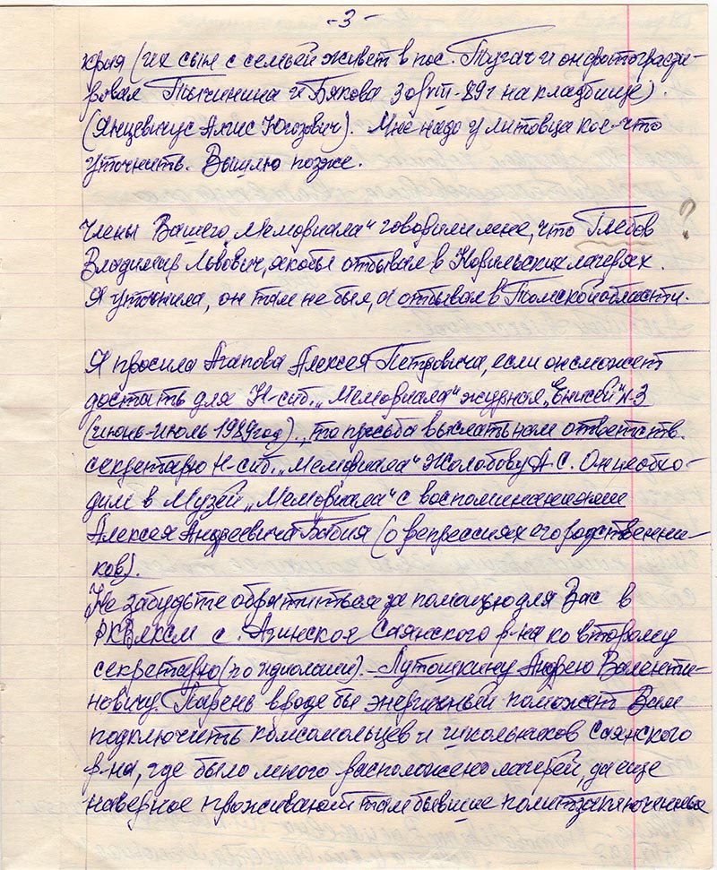 Я просила Агапова Алексея Петровича, если он сможет достать для Н-сиб. «Мемориала» журнал «Енисей» №3 (июнь-июль 1989 г.), то просьба выслать нам ответств. секретарю Н-сиб. «Мемориала» Жолобову А.С. Он необъодим в Музей «Мемориала» с воспоминаниями Алексея Андреевича Бабия (о репрессиях его родственников).