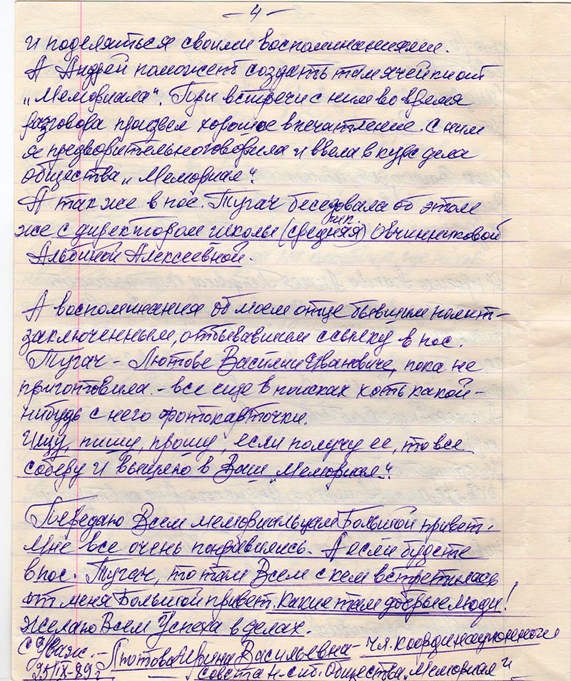 Когда я была в пос. Тугач записала их воспоминания и попросила любителя-фотографа-литовца, чтобы их сфотографировал. А вчера мне прислала фотографии с них депутат из сельсовета в пос. Тугач Перцева Татьяна Ивановна, которая большую помощь оказала в поисках могилы моего отца. Посылаю их Вам (фотографировались 30/VIII-89 г. перед днем моего отъезда, на кладбище, где похоронен мой отец).