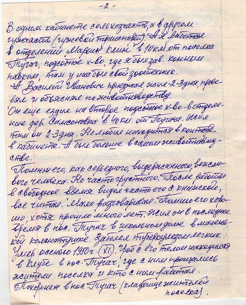 Он еще ездил на второе подсобное х-во в отделение леер. Самсоновка в 40 км от Тугача. Жил там он 2-3 дня. Не любил находится в конторе, в кабинете. А был больше в самом животноводстве.