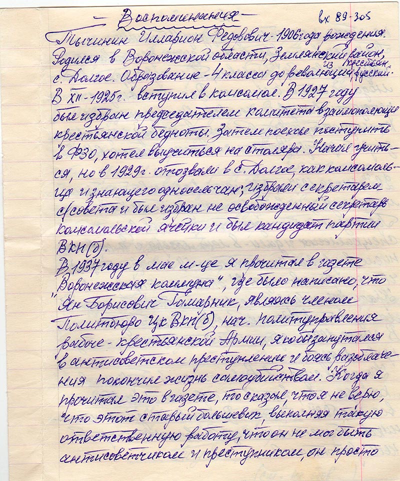 В 1937 году в мае м-це я прочитал в газете «Воронежская коммуна», где было написано, что Ян Борисович Гамарник, являясь членом Политбюро ЦК ВКП9б), нач. политуправления рабоче-крестьянской Армии, якобы запутался в антисоветском преступлении и боясь разоблачения покончил жизнь самоубийством. Когда я прочитал это в газете, то сказал, что я не верю, что этот старый большевик, выполняя такую ответственную работу, ято он не мог быть антисоветчиком и преступником, он просто не стал плясать под дудку Сталина.