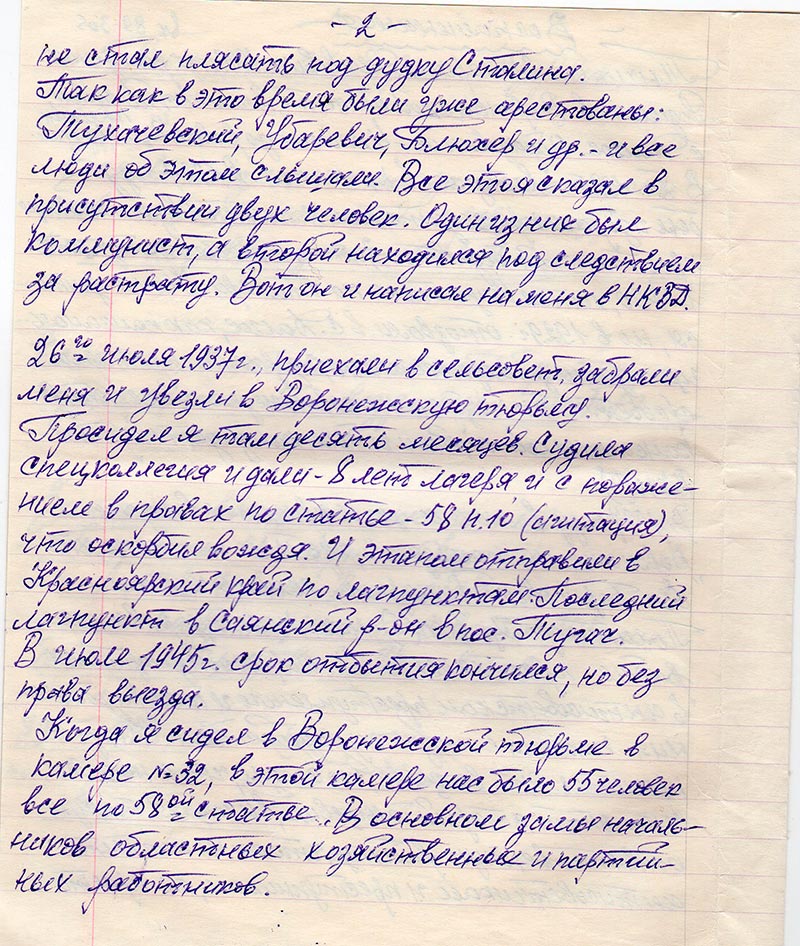 26го июля 1937 г. приехали в сельсовет, забрали меня и увезли в Воронежскую тюрьму. Просидел я там десять месяцев. Судила спецколлегия и дали – 8 лет лагеря и с поражением в правах по статье – 58 п.10 (агитация), что оскорбил вождя. И этапом отправили в Красноярский край по лагпунктам. Последний лагпункт в Саянский р-он в пос. Тугач. В июле 1945 г. срок отбытия кончился, но без права выезда.