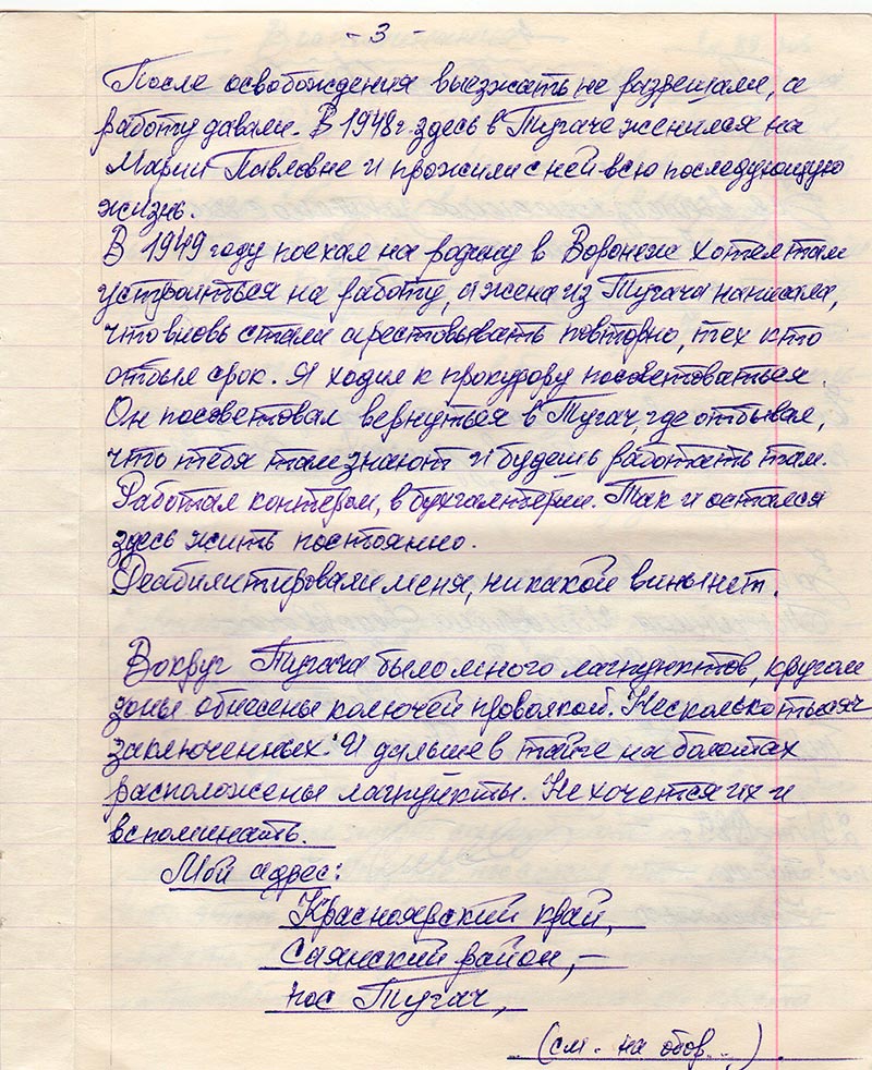 В 1949 году поехал на родину в Воронеж хотел там устроиться на работу, а жена из Тугача написала, что вновь стали арестовывать повторно, тех кто отбыл срок. Я ходил к прокурору посоветоваться. Он посоветовал вернуться в Тугач, где отбывал, что тебя там знают и будешь работать там. Работал коптером, в бухгалтерии. Так и остался здесь жить постоянно.