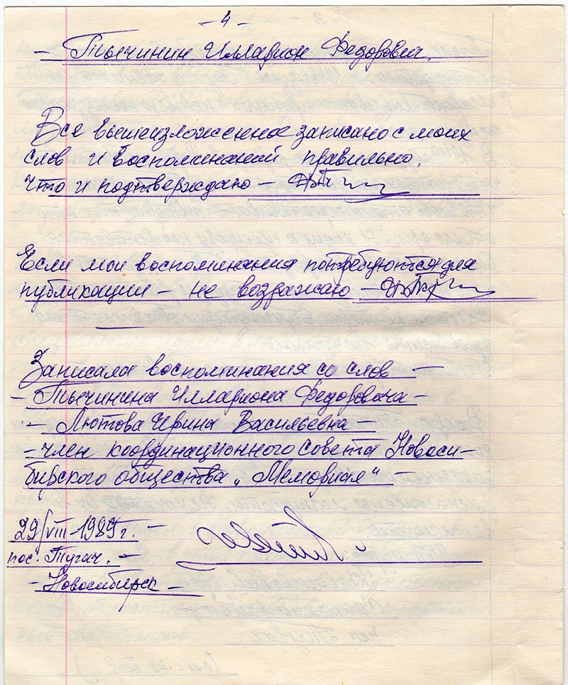 Записала воспоминания со слов – Тычинина Иллариона Федоровича – Лютова Ирина Васильевна – член координационного Совета Новосибирского общества «Мемориал»