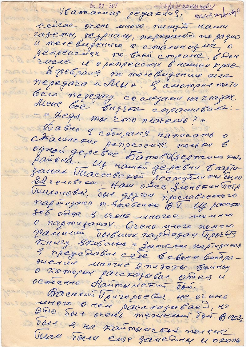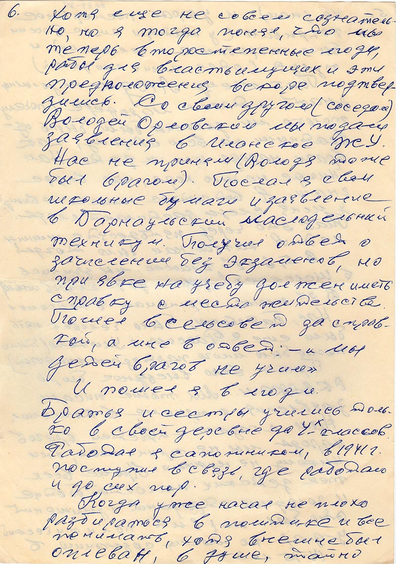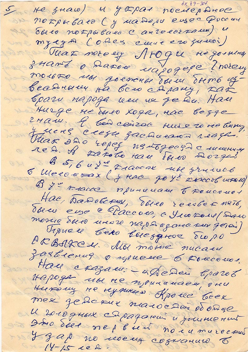 Прием вело выездное бюро СКВЛКСМ. Мы тоже писали заявление о приеме в комсомол. Нам сказали – детей врагов народа не принимаем, они никому не нужны. Кроме всех тех детских жалостей об отце и голодных страданий и унижений это был первый политический удар по моему сознанию в 14-15 лет.