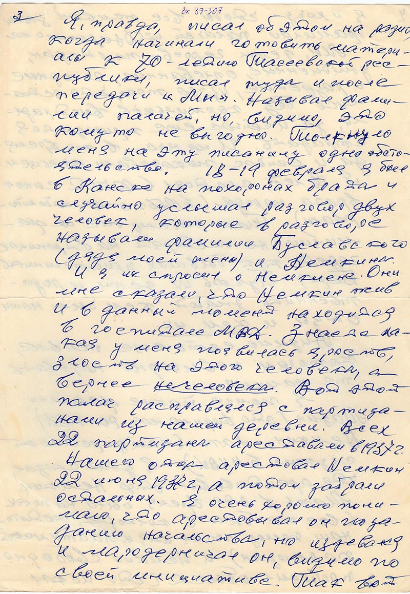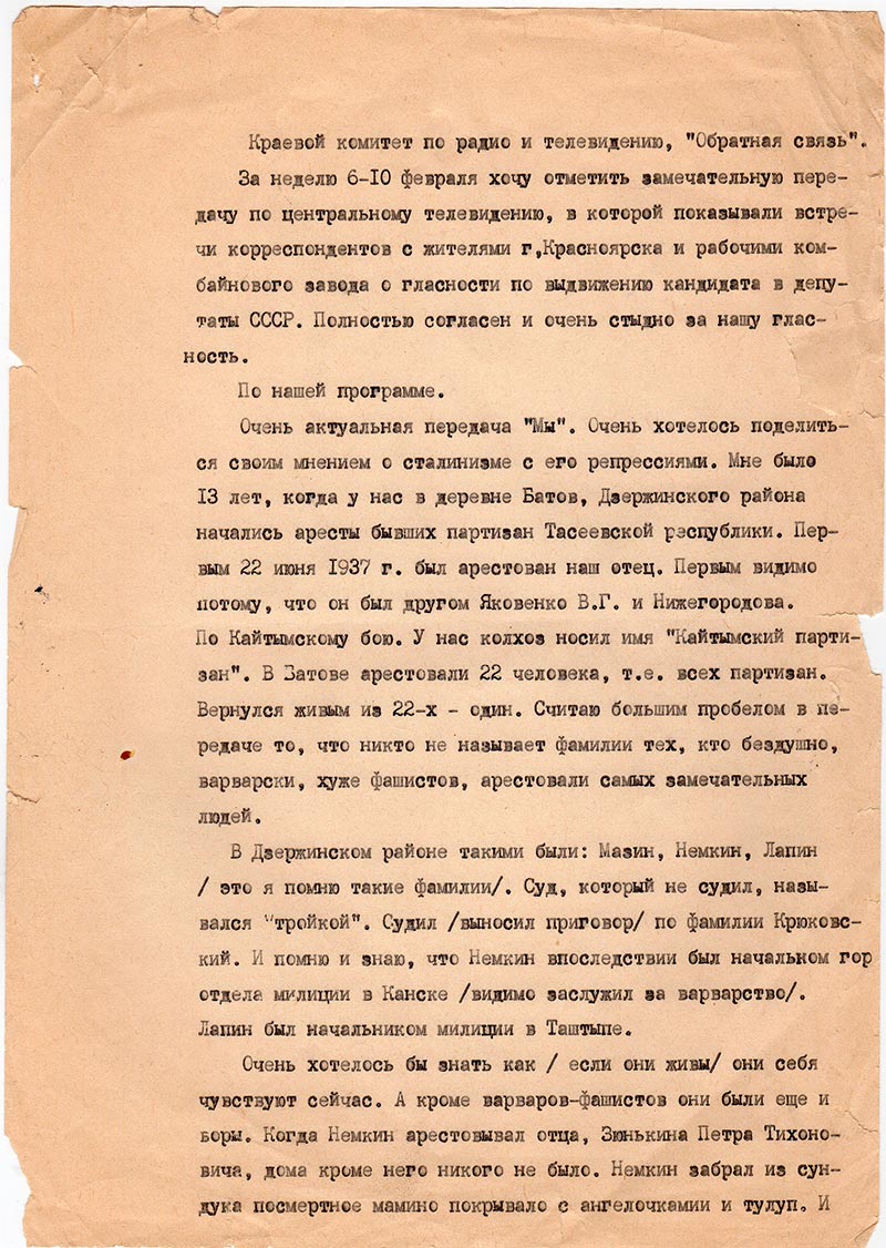 Я, правда, писал об этом на радио, когда начинали готовить материалы к 70-летию Тасеевской республики, писал туда и после передачи «Мы». Называл фамилии палачей, но, видимо, это кому то не выгодно. Толкнуло меня на эту писанину одно обстоятельство. 18-19 февраля я был в Канске на похоронах брата и случайно услышал разговор двух человек, которые в разговоре называли фамилии Буславского (дядя моей жены) и Немкина. И я их спросил о Немкине. Они мне сказали, что Немкин жив и в данный момент находится в госпитале МВД. Знаете какая у меня появилась ярость, злость на этого человека, а вернее нечеловека. Вот этот палач расправлялся с партизанами из нашей деревни. Всех 22 партизан арестовал в 1937 г. Нашего отца арестовал Немкин 22 июня 1937 г, а потом забрали остальных. Я очень хорошо понимаю, что арестовывал он по заданию начальства, но издевался и мародерничал он, видимо по своей инициативе. Так вот я и хочу чтобы все живые знали знали фамилии палачей из Дзержинска.