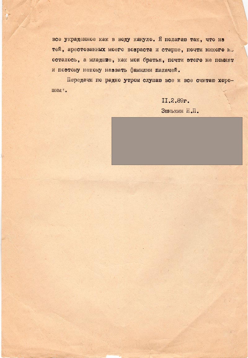 Я помню такие фамилии: Мазин (это, видимо нач. РОНКВД), Немкин, Лапин (наш деревенский служил В НКВД). Я уже сказал, что арестовывал отца Немкин. Мать в это время была на полях (все же были в колхозе, кстати наш колхоз носил имя «Кайтымский партизан») и Немкин свободно проводил обыск (что искал не знаю) и украл последное покрывало (у матери еще с России было покрывало с ангелочкам)и и тулуп (отец его сшил зимой).