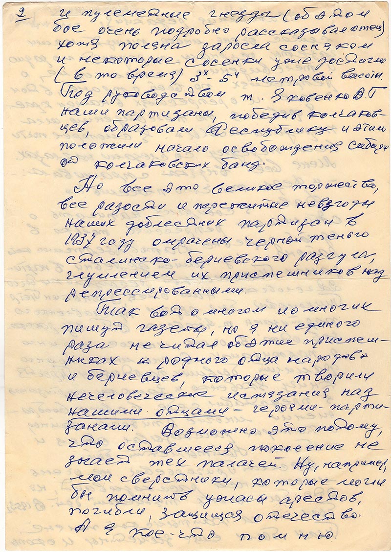 Но все это великое торжество, все радости и пережитые невзгоды наших доблестных партизан в 1937 году омрачены черной тенью сталинско-бериевского разгула, глумлением их приспешников над репрессированными.
