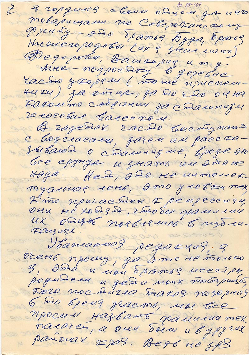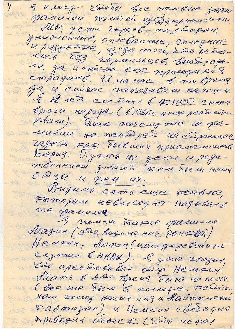 Так почему ЛЮДИ не должны знать о тком мародере? Почему только мы должны юыли быть известными на всю страну, как враги народа или их дети. Нам нигде не было хода, нас вехде гнали. Я вот сейчас ничего не вижу, у меня слезы застилают глаза. Так это через пятьдесят с лишним лет. А каково нам было тогда?