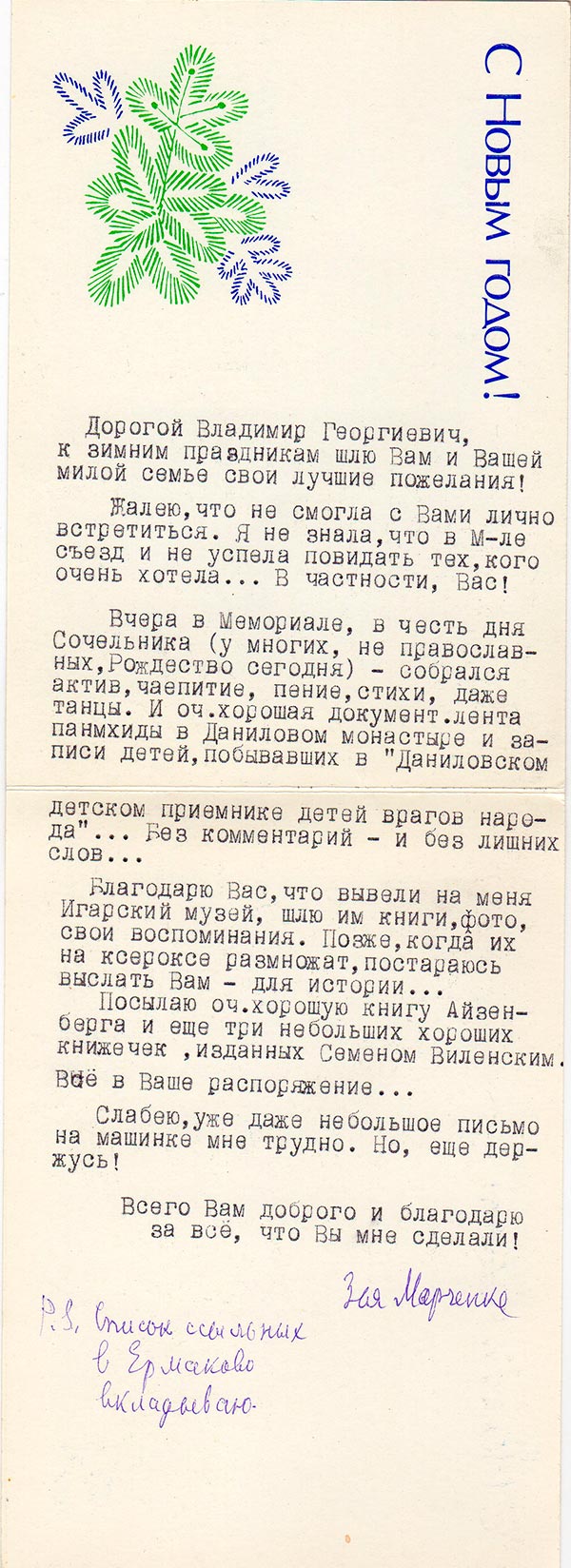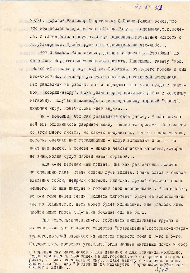 27/XII. Дорогой Владимир Георгиевич! С Новым годом! Боюсь, что это мое послание придет уже в Новом году,.. Запоздала т.к. болела. И затем болела внучка. А тут подоспела печальная новость с А. Д. Сахаровым. Просто руки не поднимались на что-либо…
