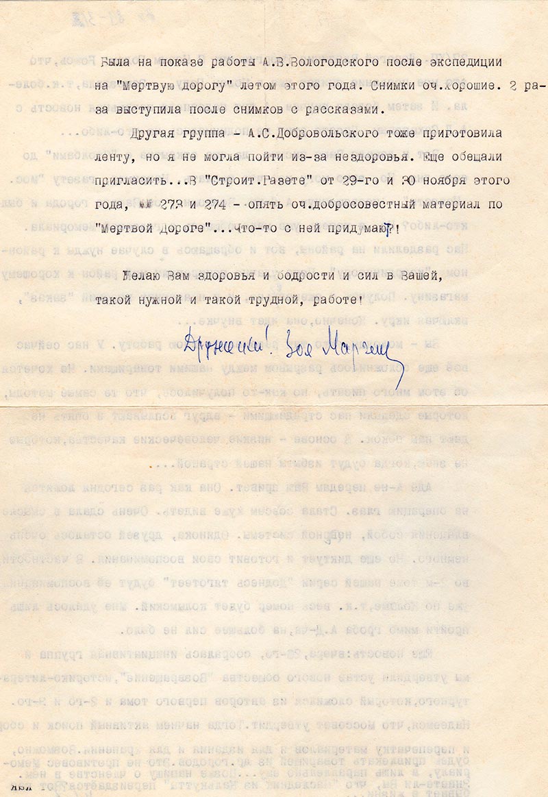 Другая группа – А. С. Добровольского тоже приготовила ленту, но я не могла пойти из-за нездоровья. Еще обещали пригласить… В «Строит. Газете» от 29-го и 30 ноября этого года, №273 и 274 – опять оч. добросовестный материал по «Мертвой дороге»… Что-то с ней придумают?!
