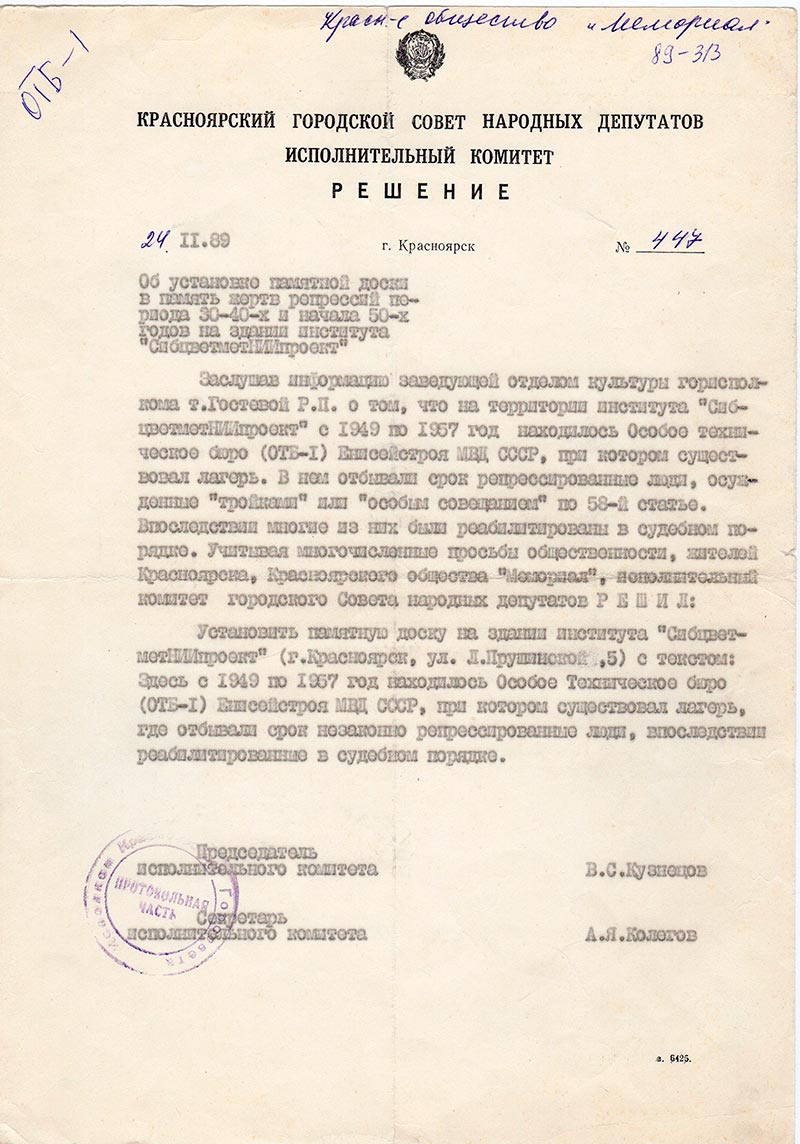 Заслушав информацию заведующей отдела культуры горисполкома тов. Гостевой Р.П. о том, что на территории института «СибцветметНИИпроект» с 1949 по 1957 год находилось Особое техническое бюро (ОТБ-1) Енисейстроя МВД СССР, при котором существовал лагерь. В нем отбывали срок репрессированные люди, осужденные «тройками» или «особым совещанием» по 58-ой статье. Впоследствии многие из них были реабилитированы в судебном порядке. Учитывая многочисленные просьбы общественности, жителей Красноярска, Красноярского общества «Мемориал», исполнительный комитет городского Совета народных депутатов РЕШИЛ: