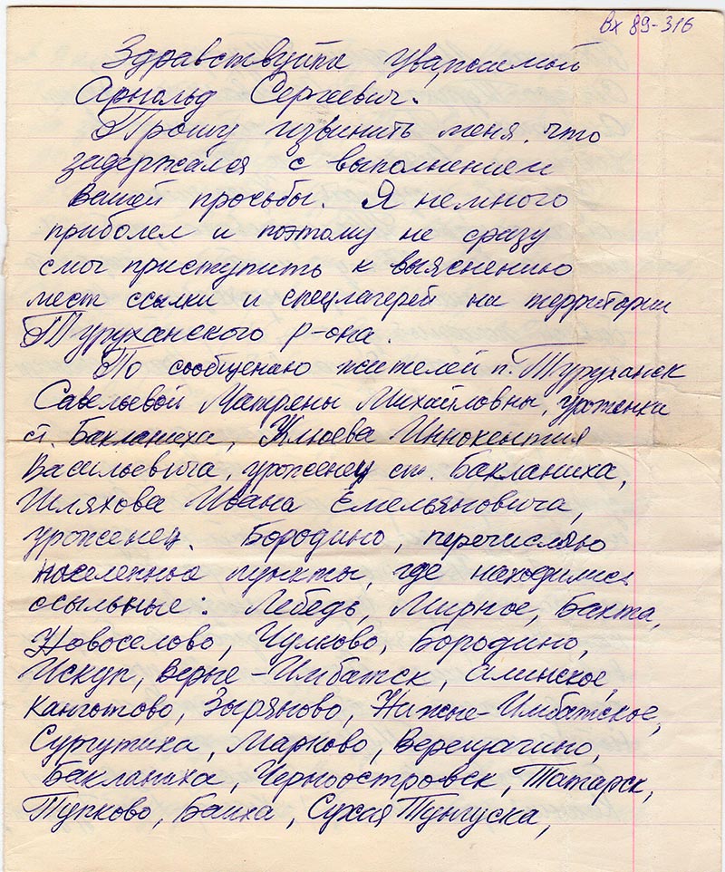 По сообщению жителей п. Туруханск Савельевой Матрены Михайловны, уроженки ст. Бакланиха, Клюева Иннокентия Васильевича, уроженец ст. Бакланиха, Шляхова Ивана Емельяновича, уроженец. Бородино, перечисляю населенные пункты, где находились ссыльные: