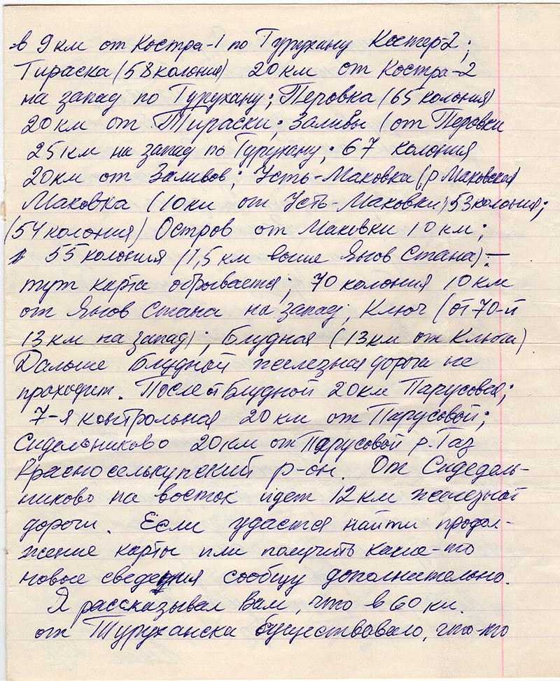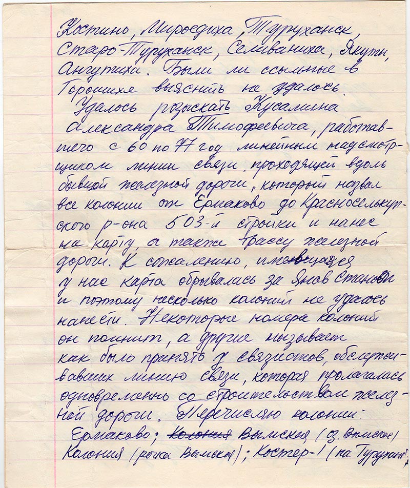 Удалось розыскать Кусамина Александра Тимофеевича, работавшего с 60 по 77 год линейным надсмотрщиком линии связи, проходящей вдоль бывшей железной дороги, который назвал все колонии от Ермаково до Красноселькупского р-она 503-й стройки и нанес на карту, а также трассу железной дороги. К сожалению, имеющаяся у нас карта обрывалась за Янов Станом и поэтому несколько колоний не удалось нанести. Некоторые номера колоний он помнит, а другие называет как было принято у связистов, обслуживавших линию связи, которая пролагалась одновременно со строительством железной дороги. Перечисляю колонии: Ермаково, Вымская(оз. Вымское), Колония (река Вымская); Костер-1 (на Турухане), в 9 км от Костра-1 по Турухану Костер-2; Тираска (58 колония) 20 км от Костра-2 на запад по Турухану; Перовка (65 колония) 20 км от Тираски; Заливы (от Перовки 25 км на запад по Турухану; 67 колония 20 км от Заливов; Усть-Маковка (р. Маковская) Маковка (10 км от Усть-Маковки); 53 колония;(54 колония) Остров от Маковки 10 км; 55 колония (1,5 км выше Янов Стана)-тут карта обрывается;70 колония 10 км от Янов Стана на запад; Ключ (от 70-й 13 км на запад); Блудная (13 км от Ключа) Дальше Блудной железная дорога не проходит. После ст. Блудной 20 км Парусовка; 7-я контрольная 20 км от Парусовой; Сидельниково 20 км от Парусовой р. Таз Красноселькупский р-он. От Сидедельниково на восток идет 12 км железной дороги. Если удастся найти продолжение карты или получить какие-то новые сведения сообщу дополнительно.