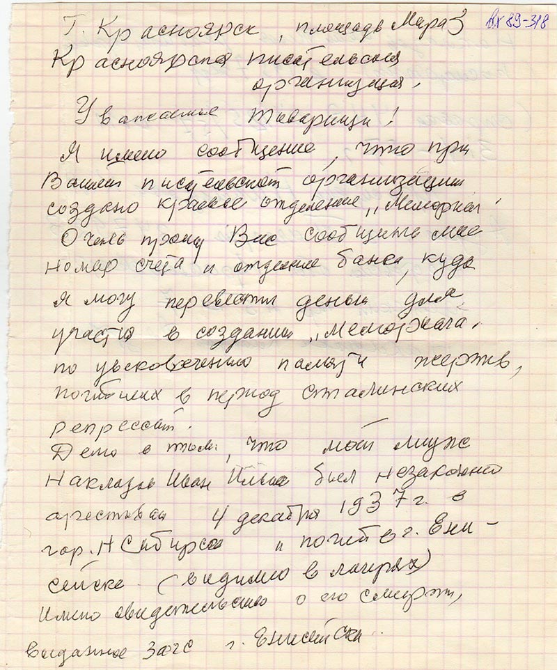 Очень прошу Вас сообщить мне номер счета и отделение банка, куда я могу перевести деньги для участия в создании «Мемориала» по увековечиванию памяти жертв, погибших в период сталинских репрессий.