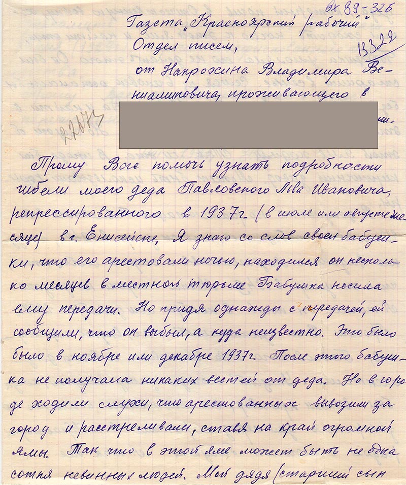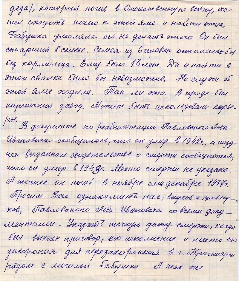 Прошу Вас помочь узнать подробности гибели моего деда Павловского Льва Ивановича, репрессированного в 1937 г. (в июле или августе месяце) в г. Енисейске. Я знаю со слов своей бабушки, что его арестовали ночью, находился он несколько месяцев в местной тюрьме Бабушка носила ему передачи. Но придя однажды с передачей, ей сообщили, что он выбыл, а куда неизвестно. Это было в ноябре или декабре 1937 г. После этого бабушка не получала никаких вестей от деда. Но в городе ходили слухи, что арестованных вывозили за город и расстреливали, ставя на край огромной ямы. Так что в этой яме может быть не одна сотня невинных людей. Мой дядя (старший сын деда), который погиб в Отечественную войну, хотел сходить ночью к этой яме и найти отца. Бабушка умоляла его не делать этого Он был старший в семье. Семья из 6 человек осталась бы без кормильца. Ему было 18 лет. Да и найти в этой свалке было бы невозможно. Но слухи об этой яме ходили. Так ли это. В городе был кирпичный завод. Может быть использовали карьеры.