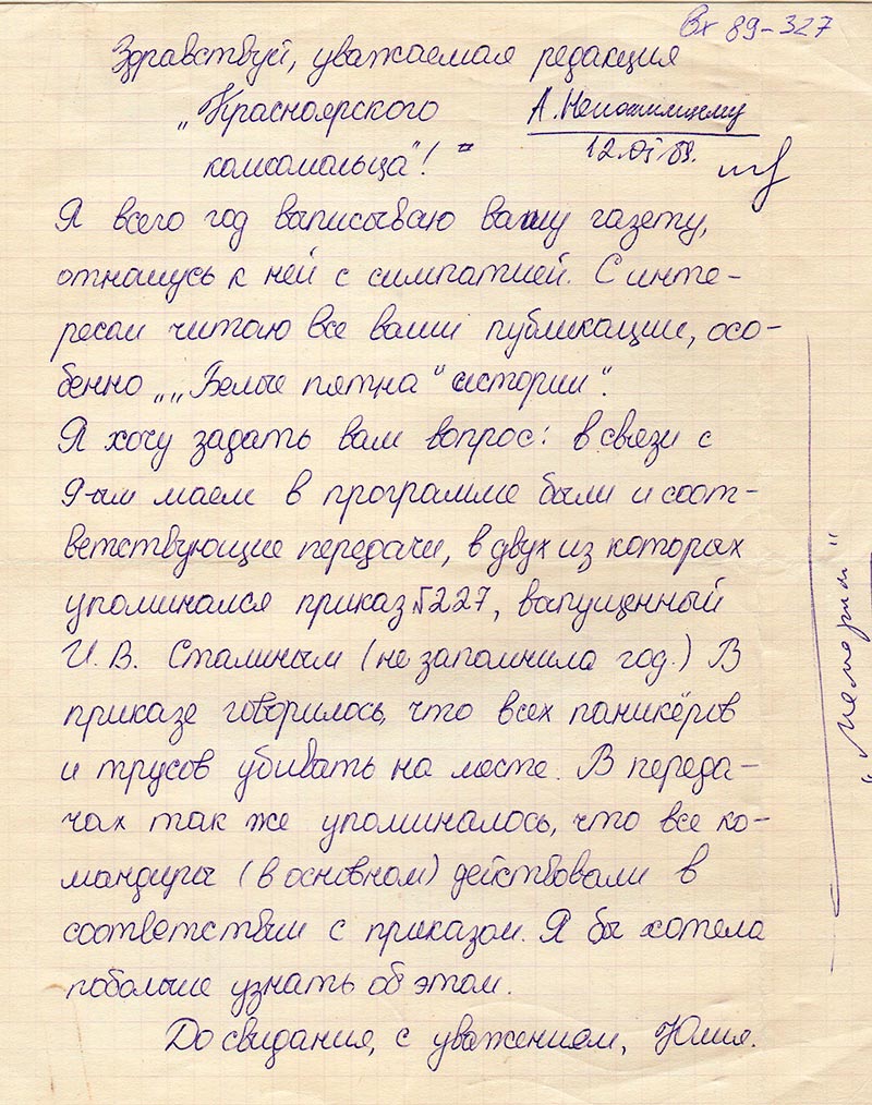 Здравствуй, уважаемая редакция «Красноярского комсомольца»!