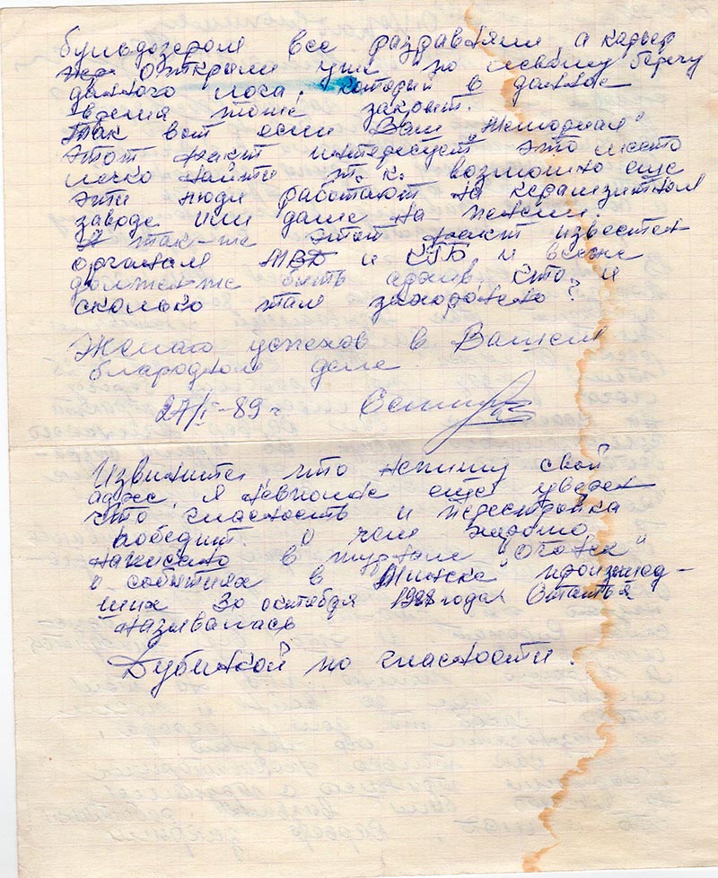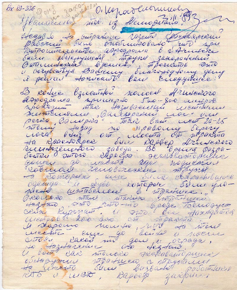 Недавно на странице газеты «Красноярский рабочий» был опобликовано, что при строительстве аэродрома в г. Ачинске были обнаружены трупы захоронений сталинских времен. Прочитав это и сочувствуя Вашему благородному делу, я решил написать Вам следующее: