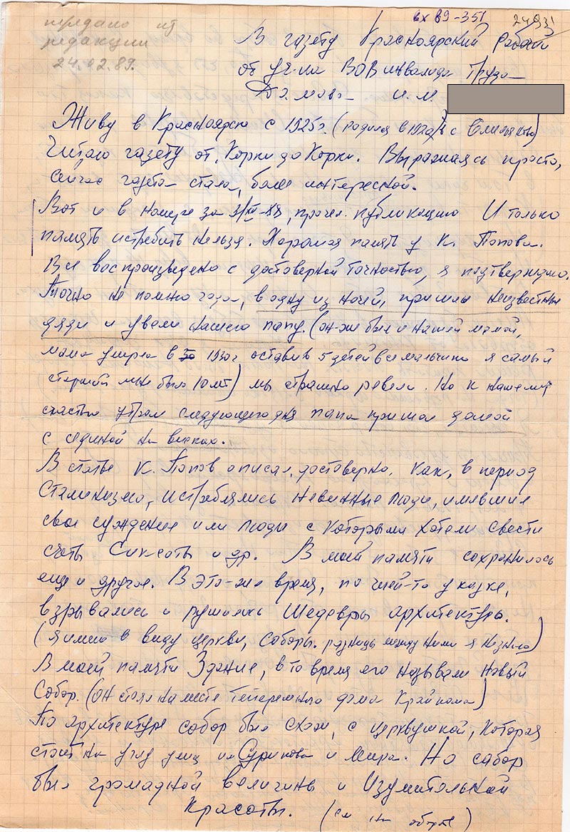 Вот и в номере за 3/XII-88 г., прочел публикацию «И только память истребить нельзя». Хорошая память у К. Попова. Все воспроизведено с достоверной точностью, я подтверждаю. Точно не помню года, в одну из ночей, пришли неизвестные дяди и увели нашего папу (он же был и нашей мамой, мама умерла в 1930 оставив 5 детей все мальчики я самый старший мне было 10 лет) мы страшно ревели. Но к нашему счастью утром следующего дня па-па пришол домой с сединой на висках.